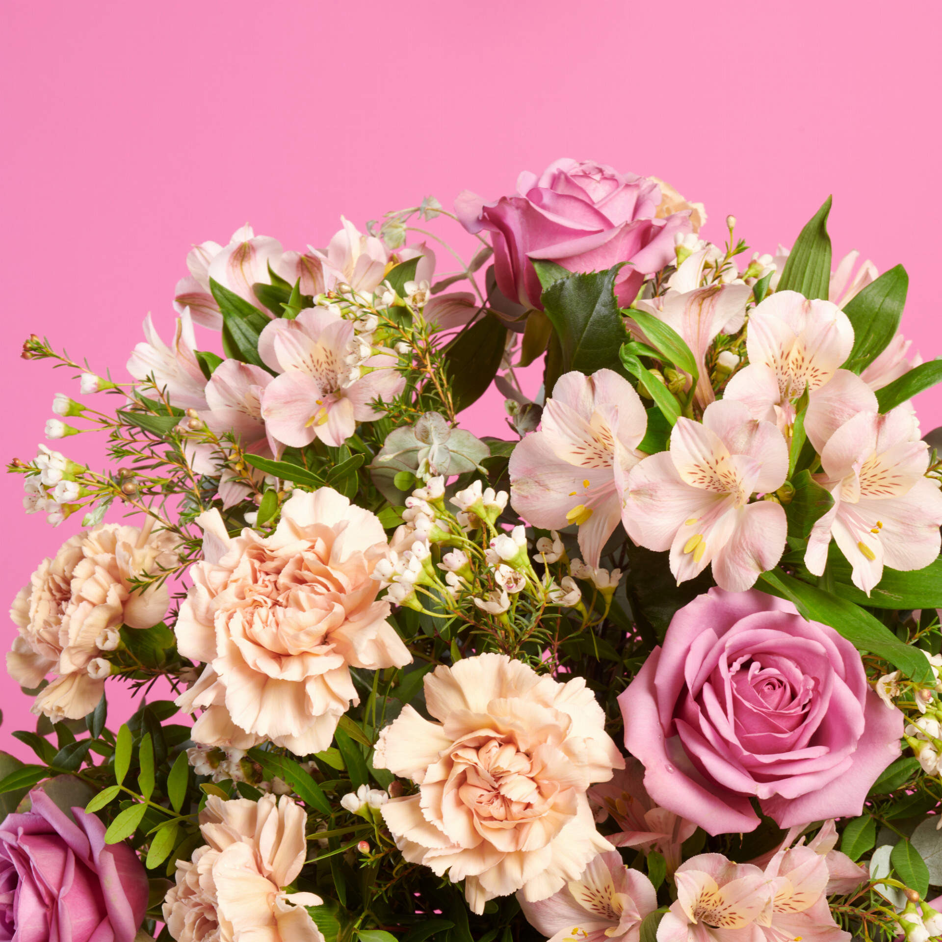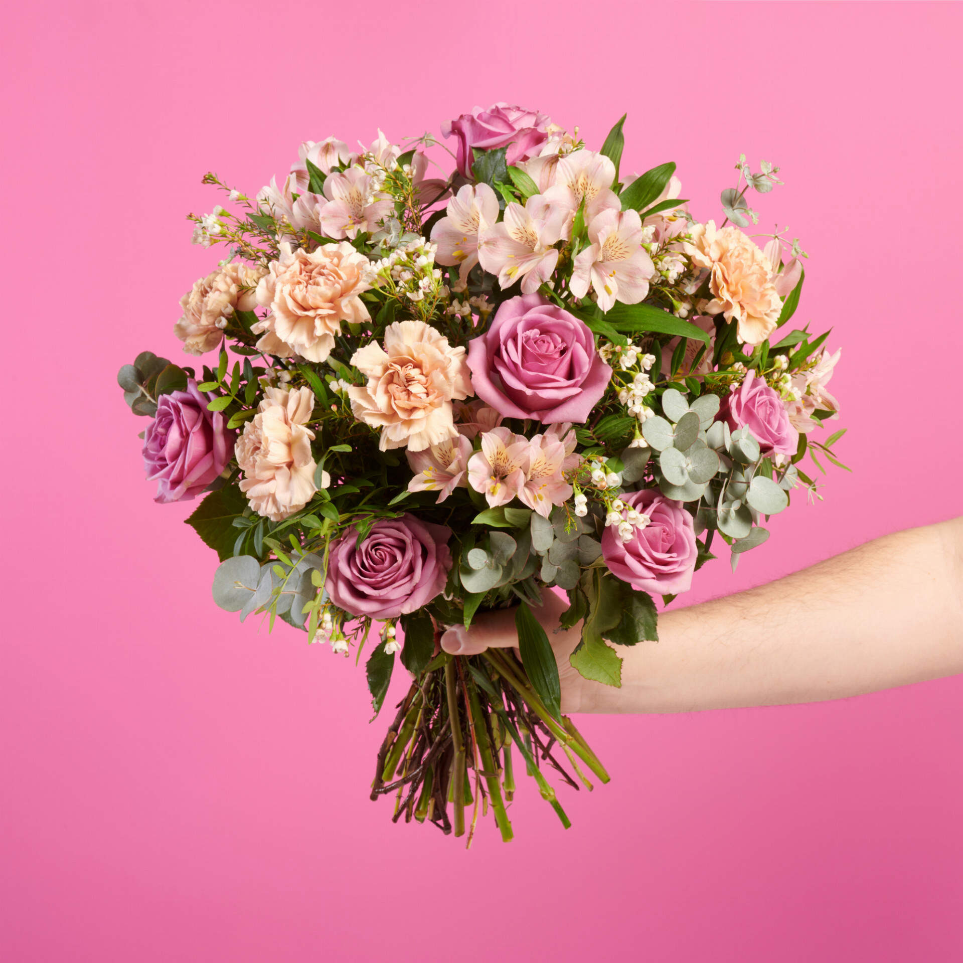 En Bésame Mucho, hemos creado este ramo de flores con las mejores rosas , claveles y verdes, para que tu solo tengas que preocuparte de que poner en la dedicatoria. Elaborado con rosas lilas, claveles color salmón y nuestra mejor selección de eucaliptos y lentiscos de cultivos sostenibles y locales.