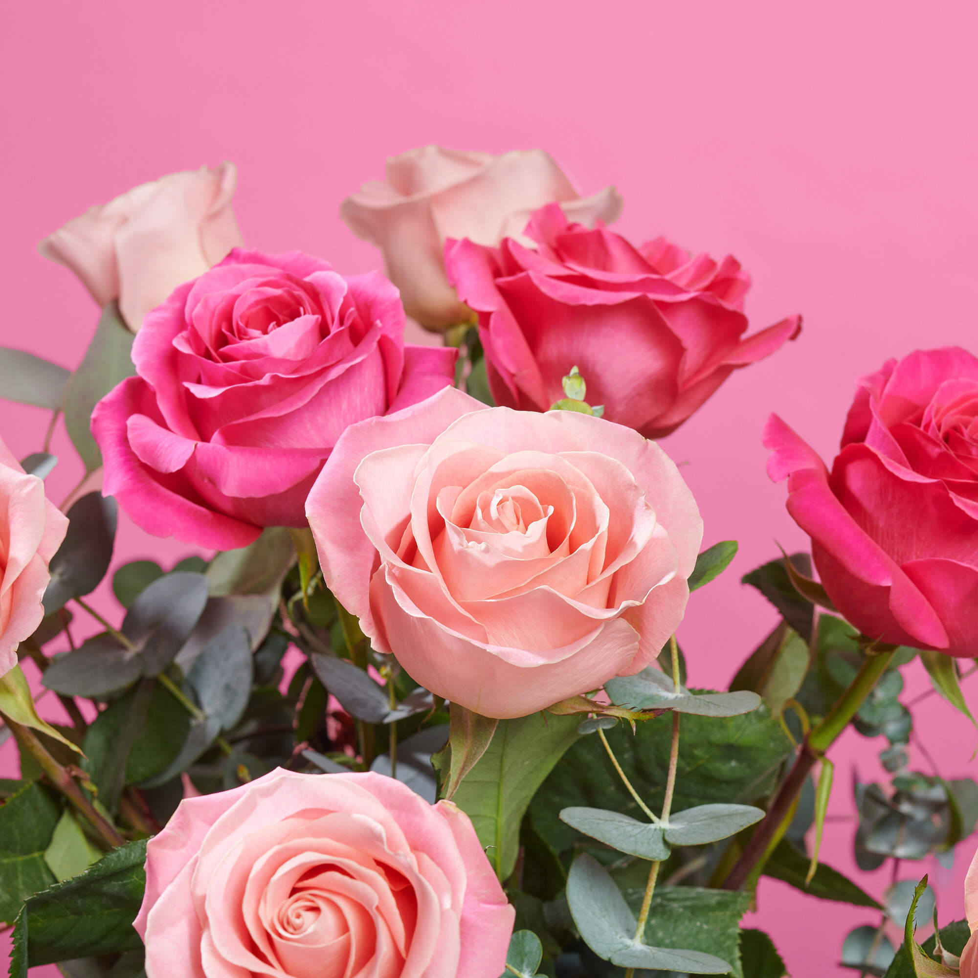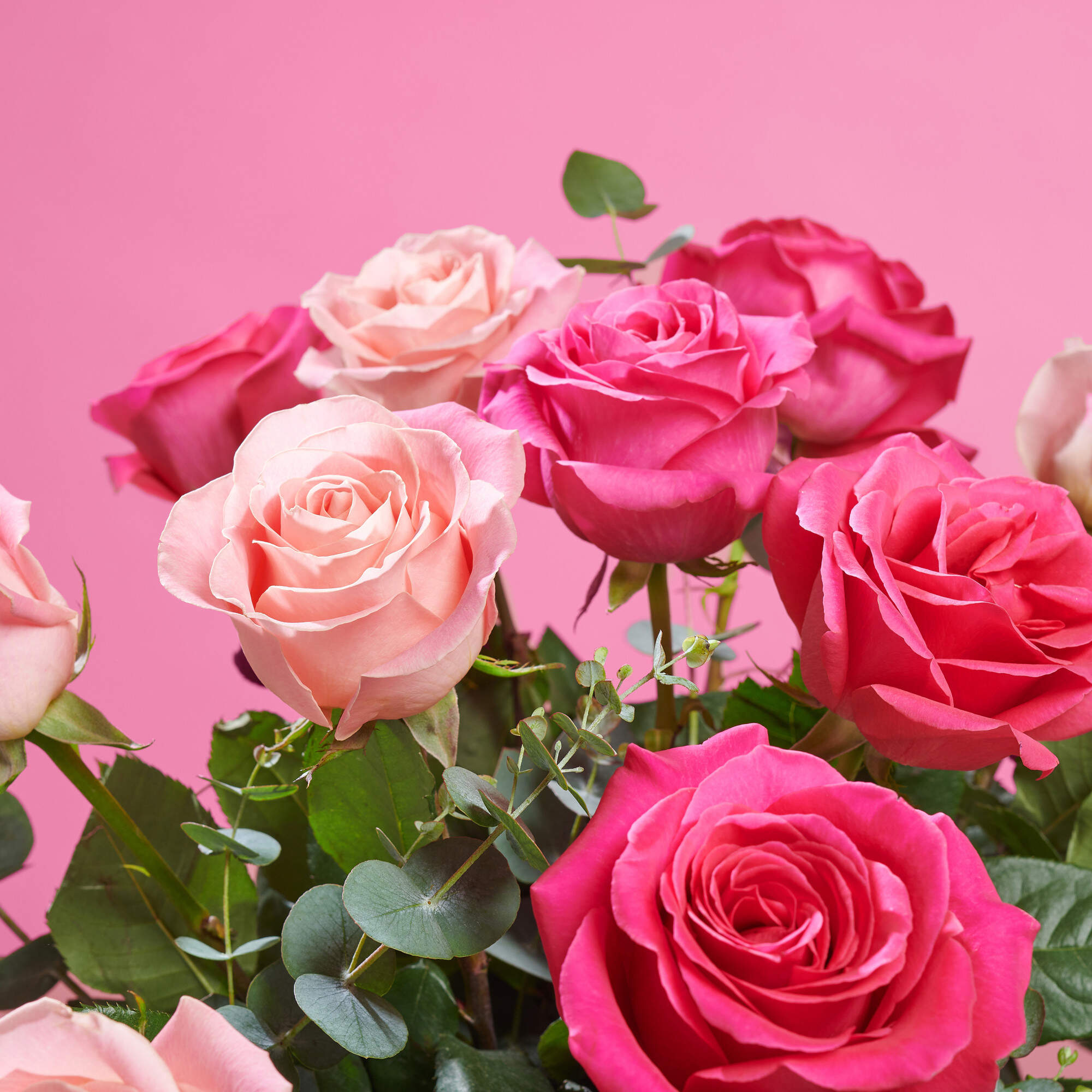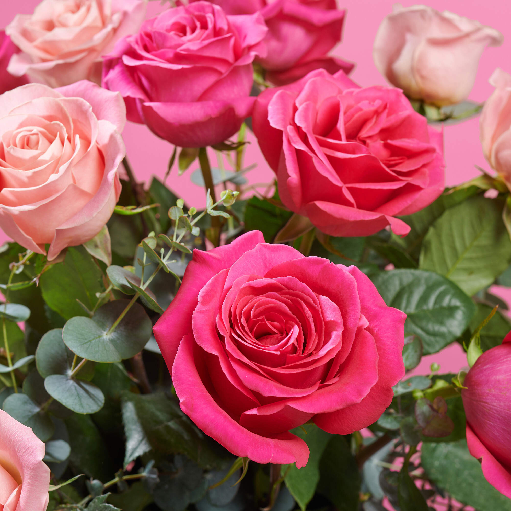 Este ramo de rosas esta compuesto por nuestra combinación de 50% rosas fucsias, 50% rosas maquillaje y nuestros mejores verdes frescos como eucalipto y lentisco.