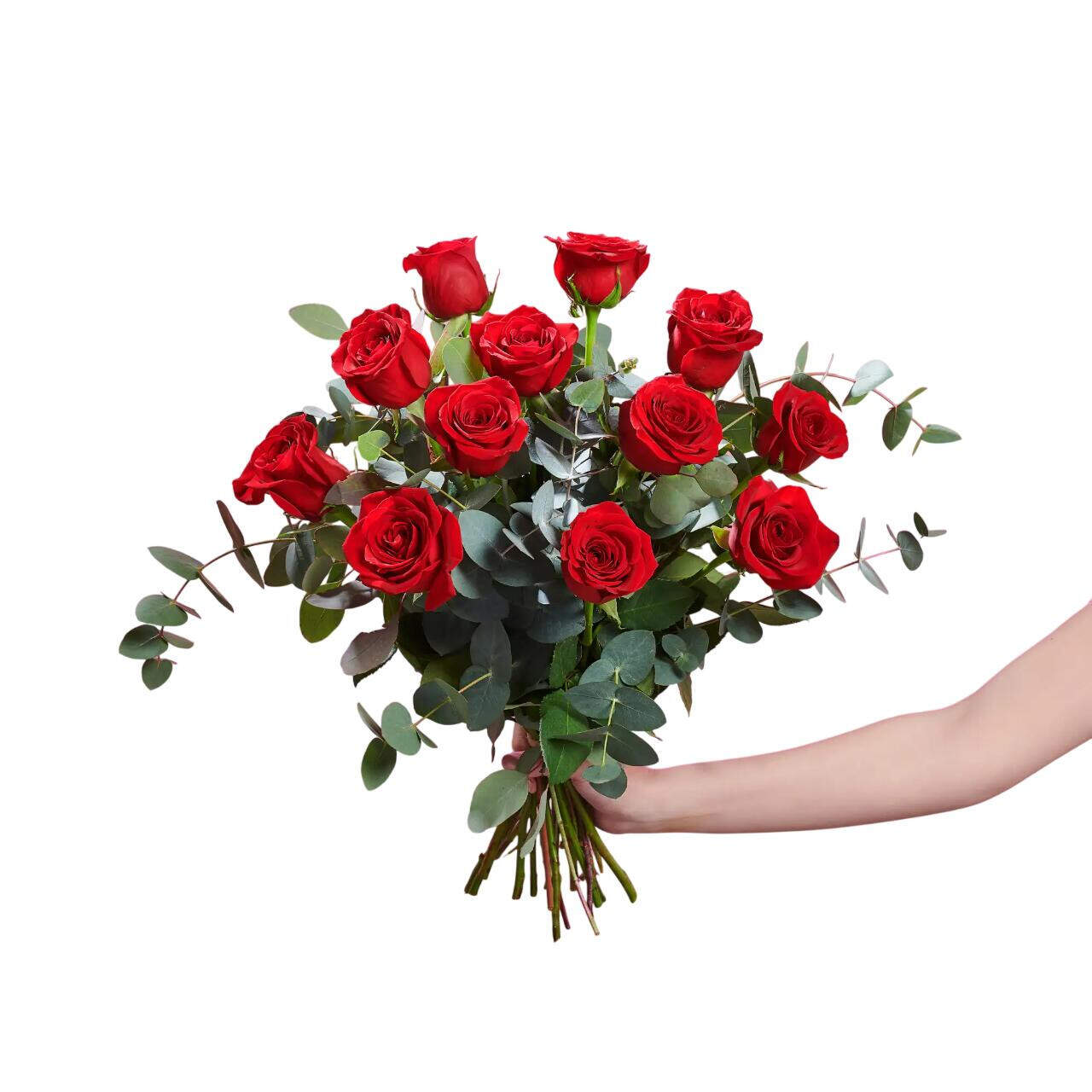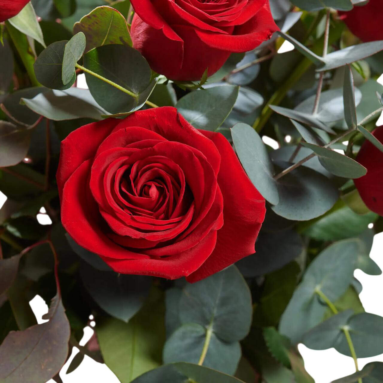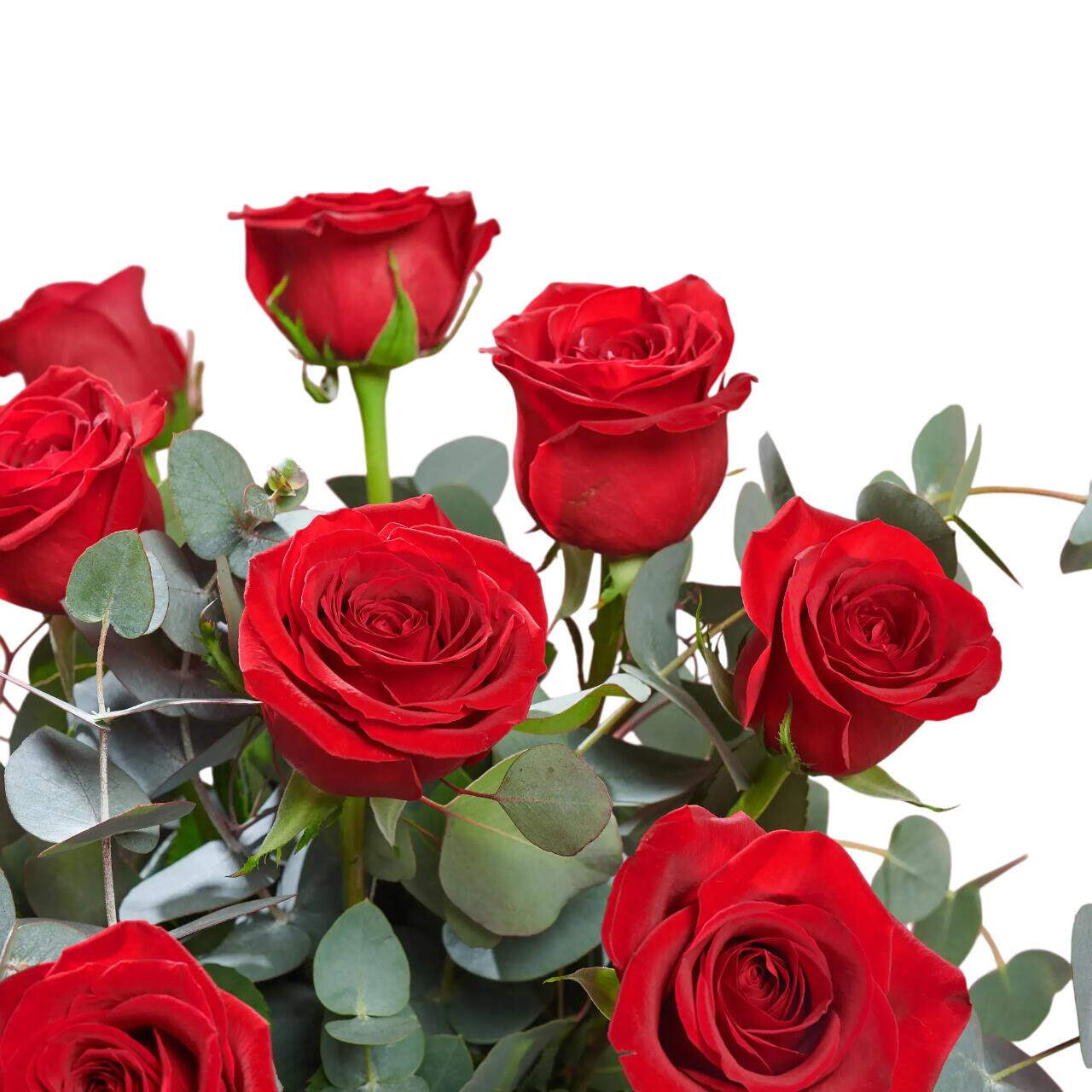 Las rosas rojas se han convertido desde el inicio de los tiempos en el símbolo de la pasión por excelencia y el eucalipto tiene un poder atrayente que hará que vuestro amor sea eterno.