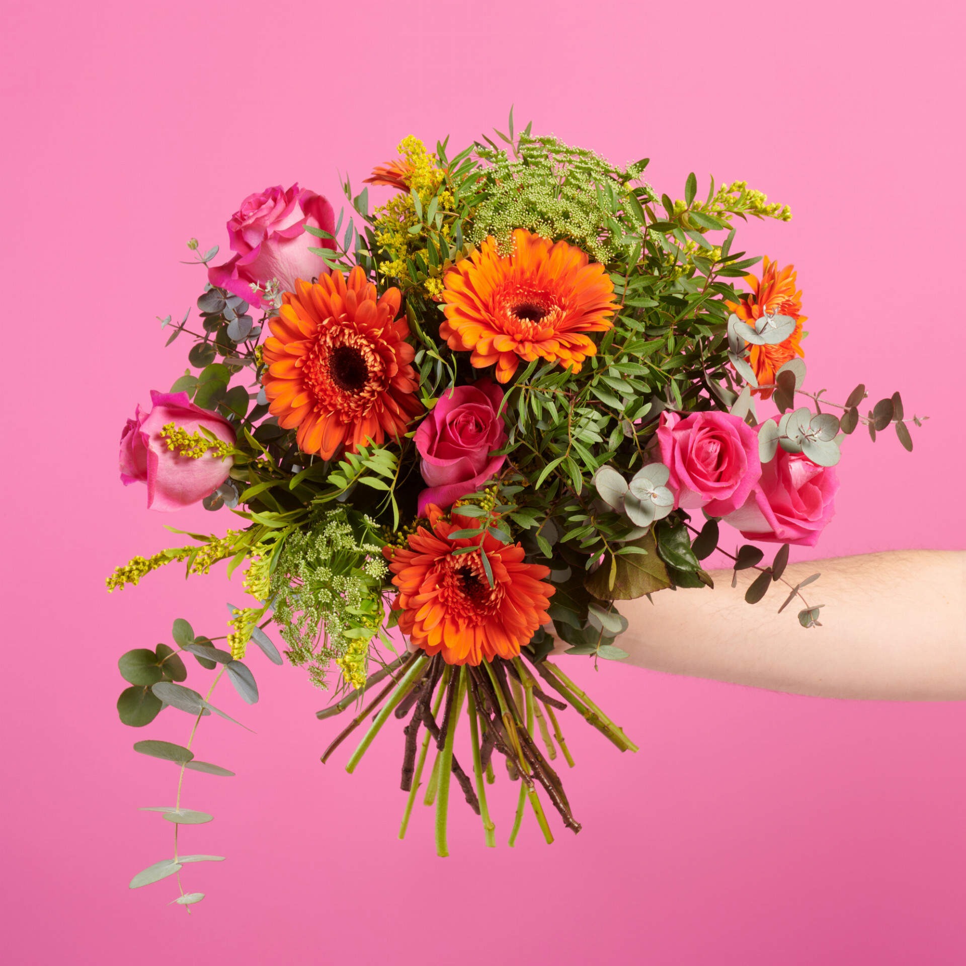 Este ramo de gerberas esta elaborado con gerberas naranjas, rosas colorfucsia y nuestra mejor selección de eucaliptos y lentiscos de cultivos sostenibles y locales.