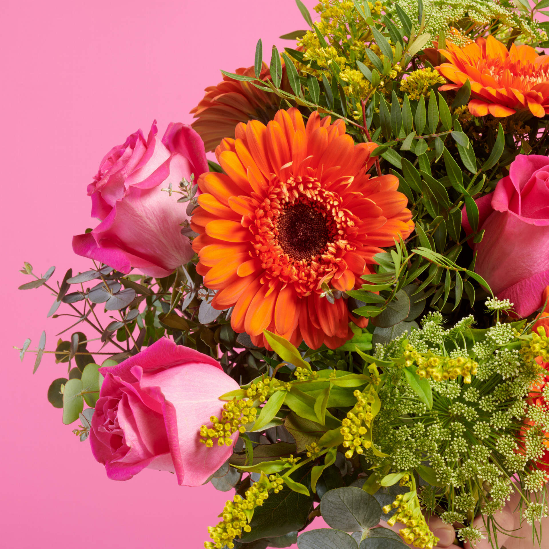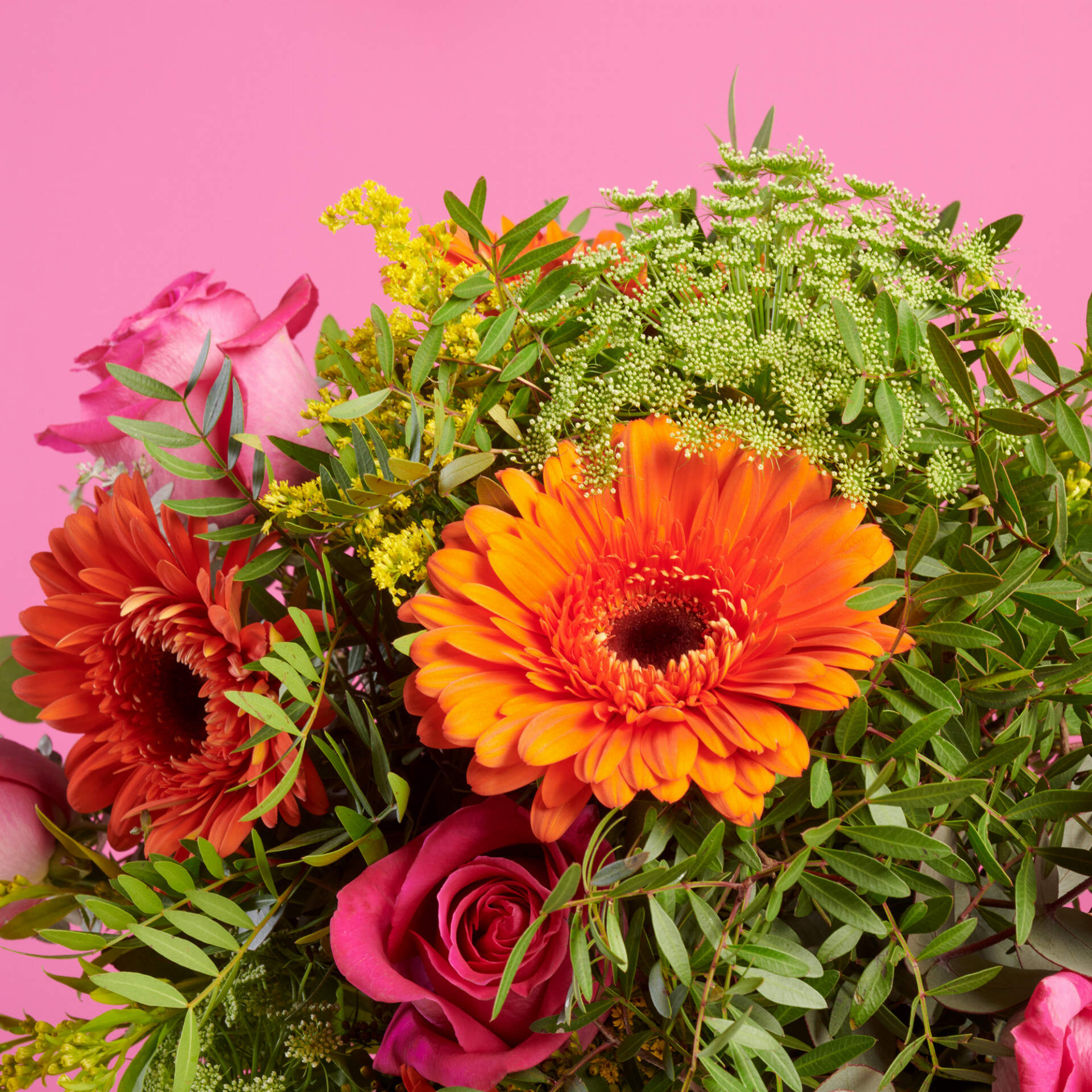 Ramo de gerberas naranjas y rosas fucsias Mítica Fantasía