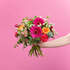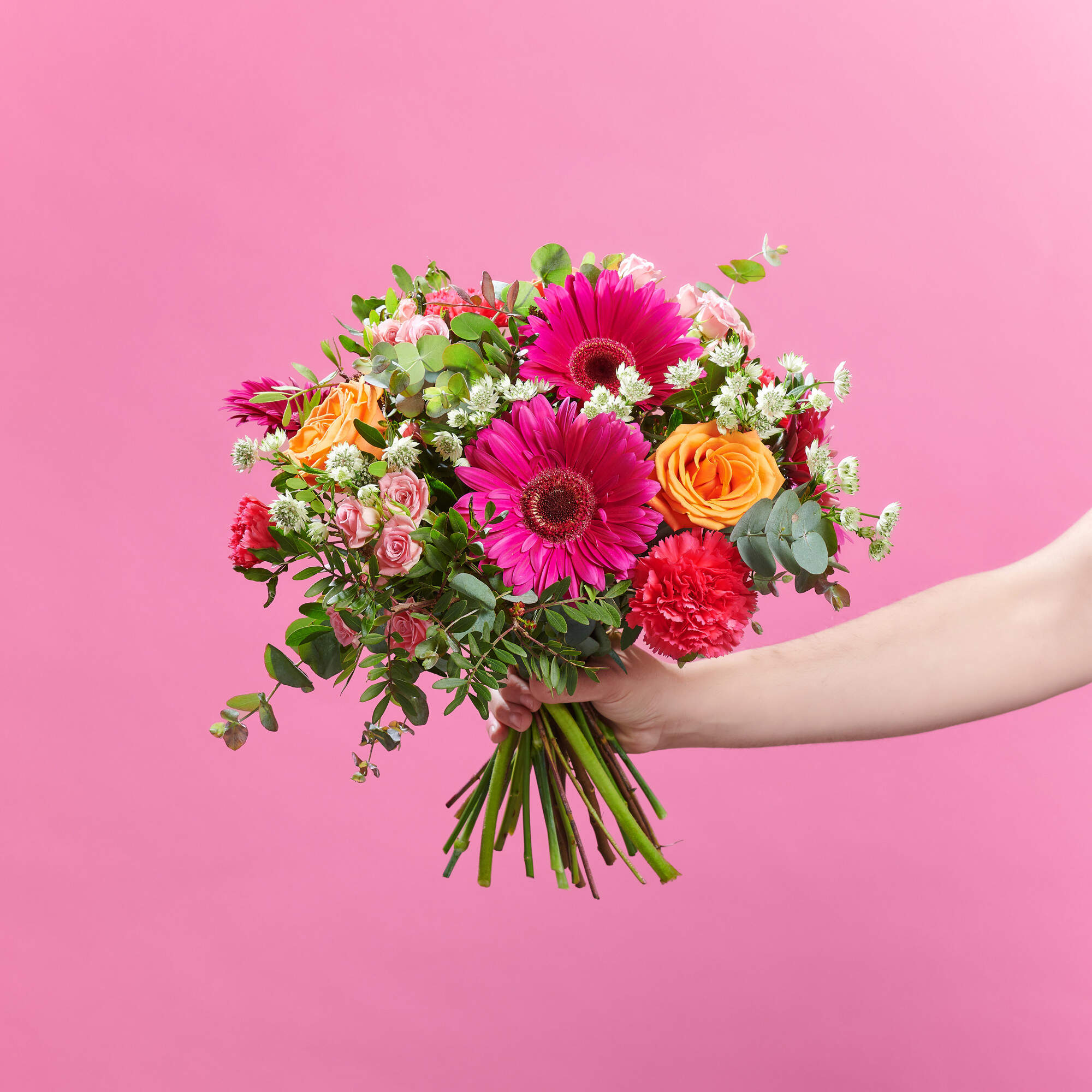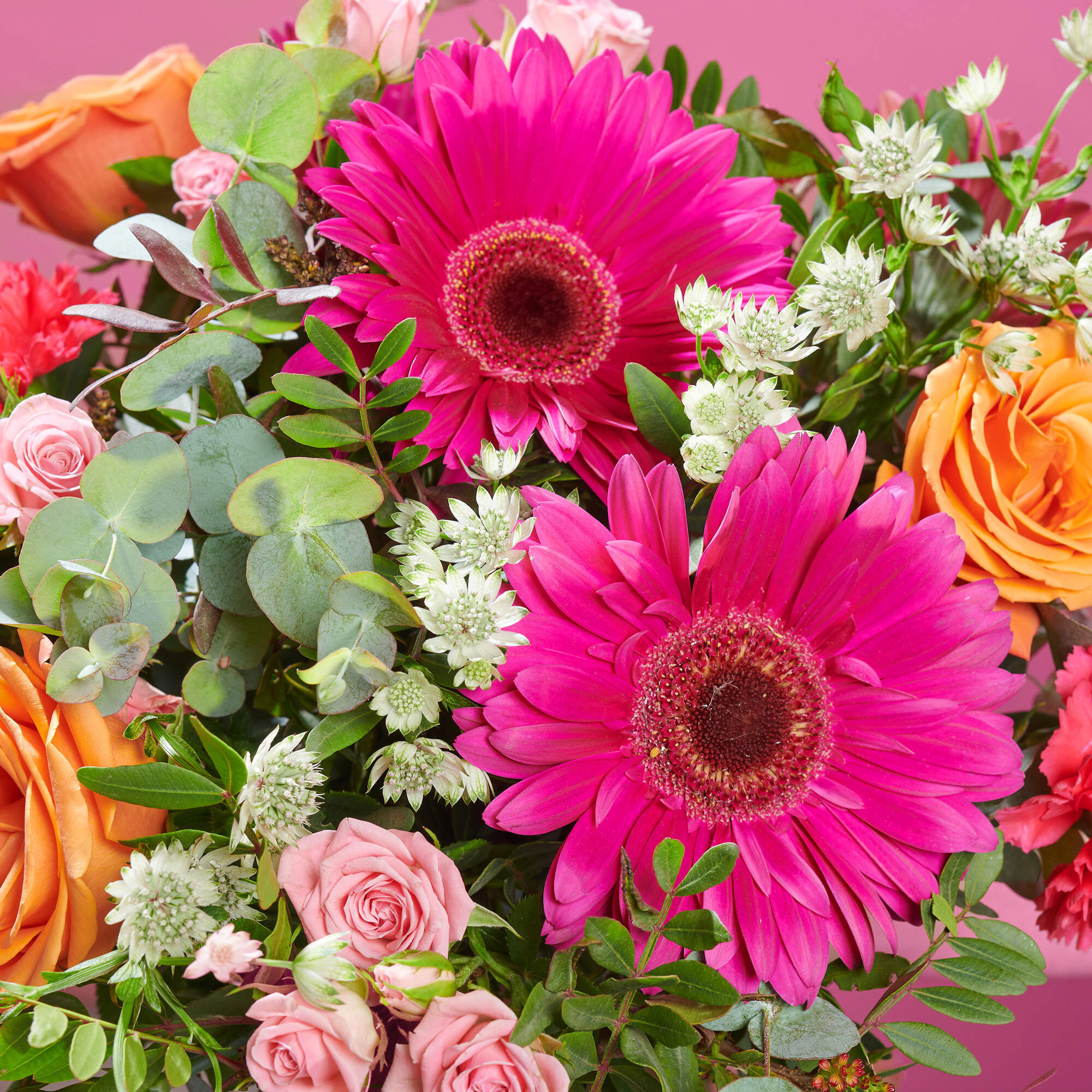 Este ramo de gerberas esta elaborado con Gerberas Fucsia, claveles, rosas color naranja, mini rosa rosa, Astrantia y nuestra mejor selección de eucaliptos y lentiscos de cultivos sostenibles y locales.