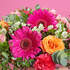 Nuestras gerberas fucsia te dan la bienvenida y te hacen sentir especial, las rosas anaranjadas te llenan de ilusión y vida, nuestros claveles magenta te sorprenden y te hacen sonreír, mientras pequeñas rosas rosas y flores silvestres blancas.