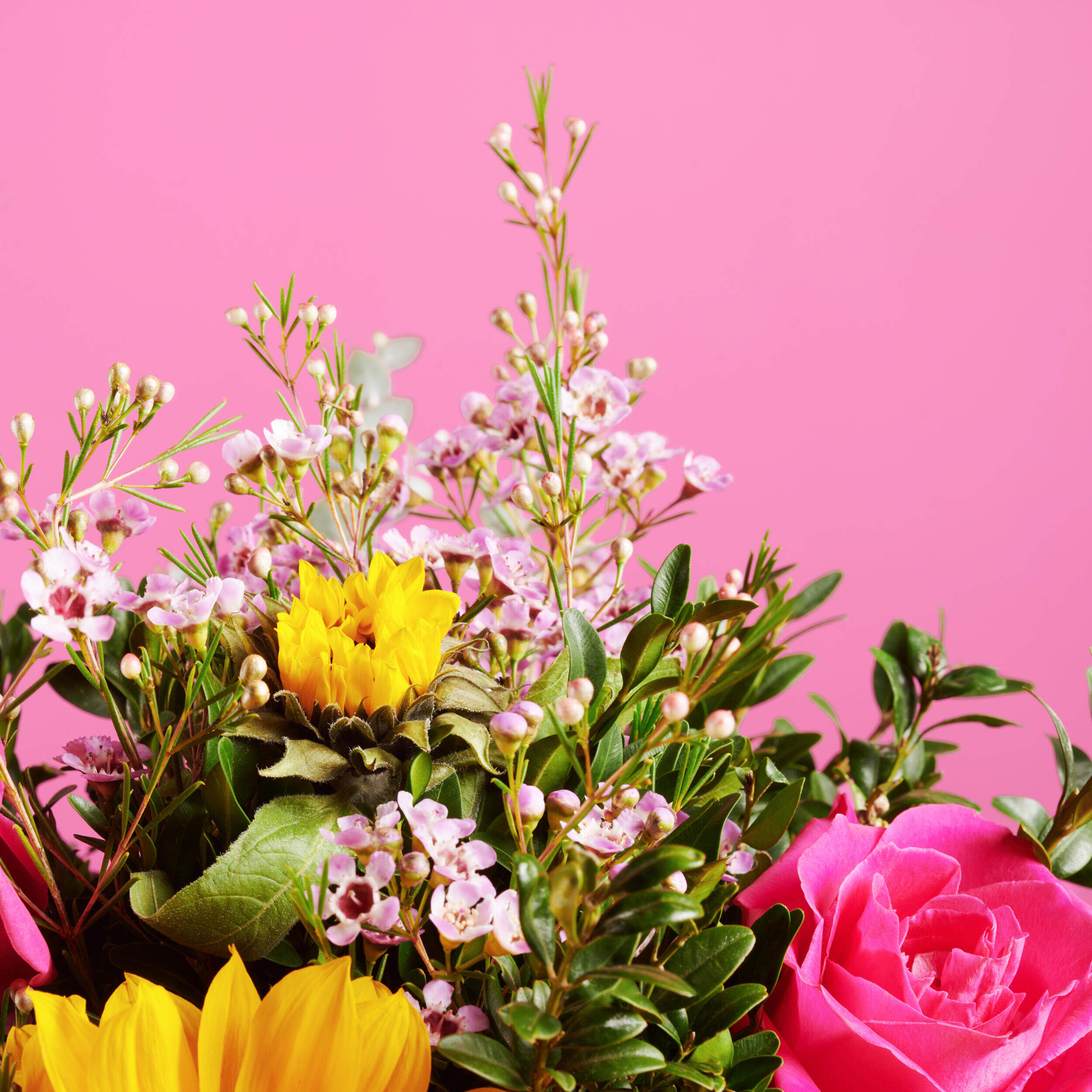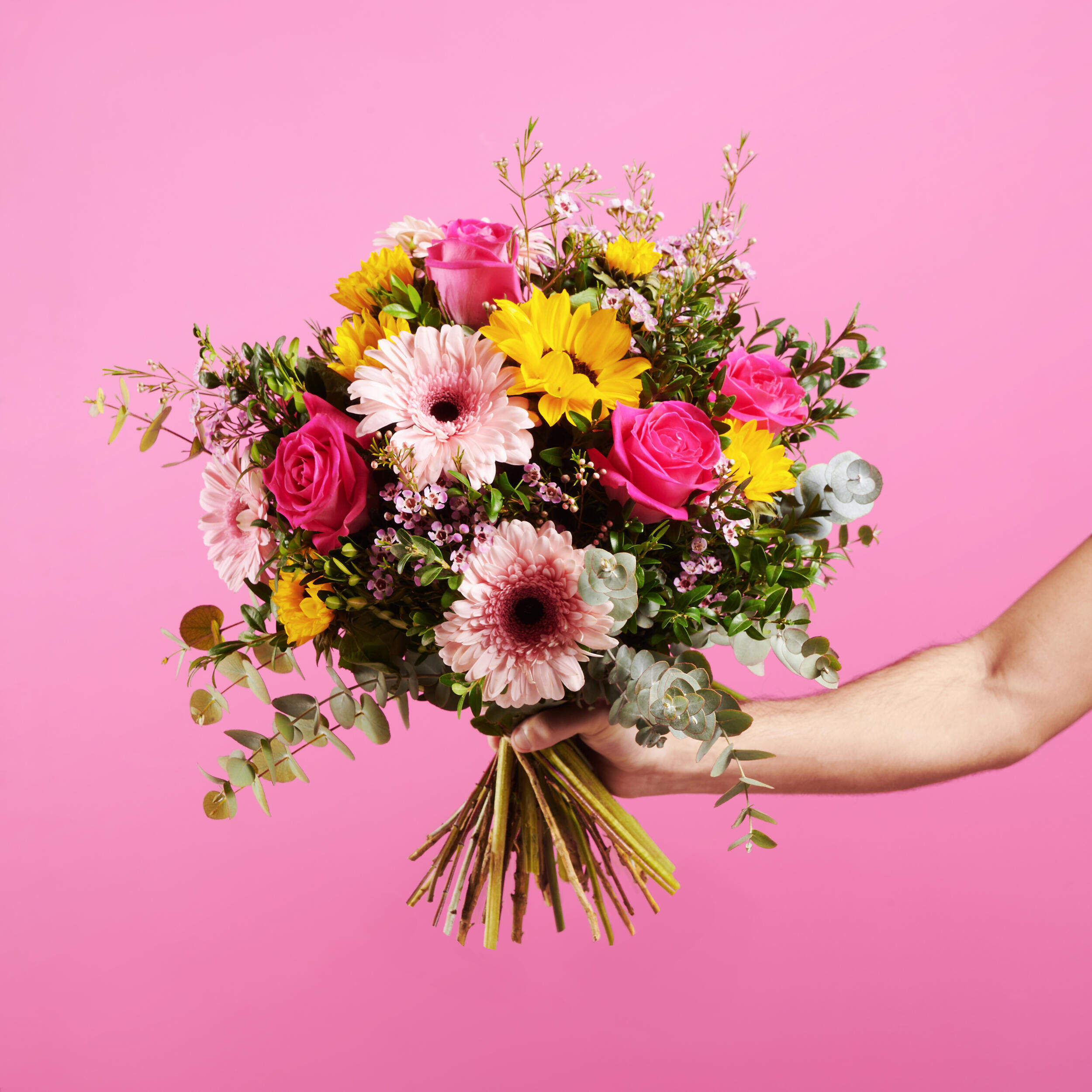 La luz de nuestros girasoles se funde con la delicadeza de nuestras rosas más intensas en presencia de las gerberas y de una densa vegetación, que aporta ese frescor tan deseado en verano. Tómate un respiro y sorprende con esta combinación de contrastes creando momentos irrepetibles con nuestro Caricias al Sol.