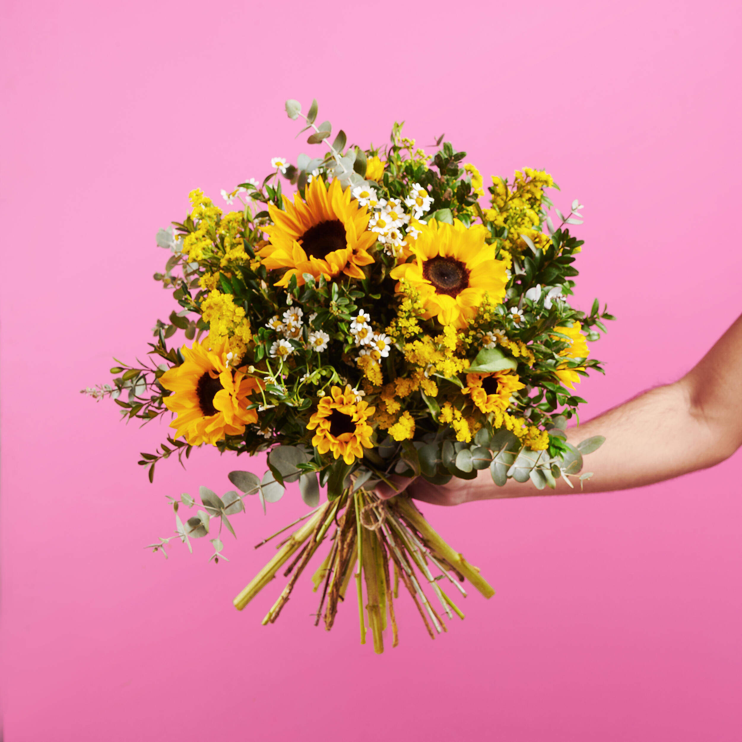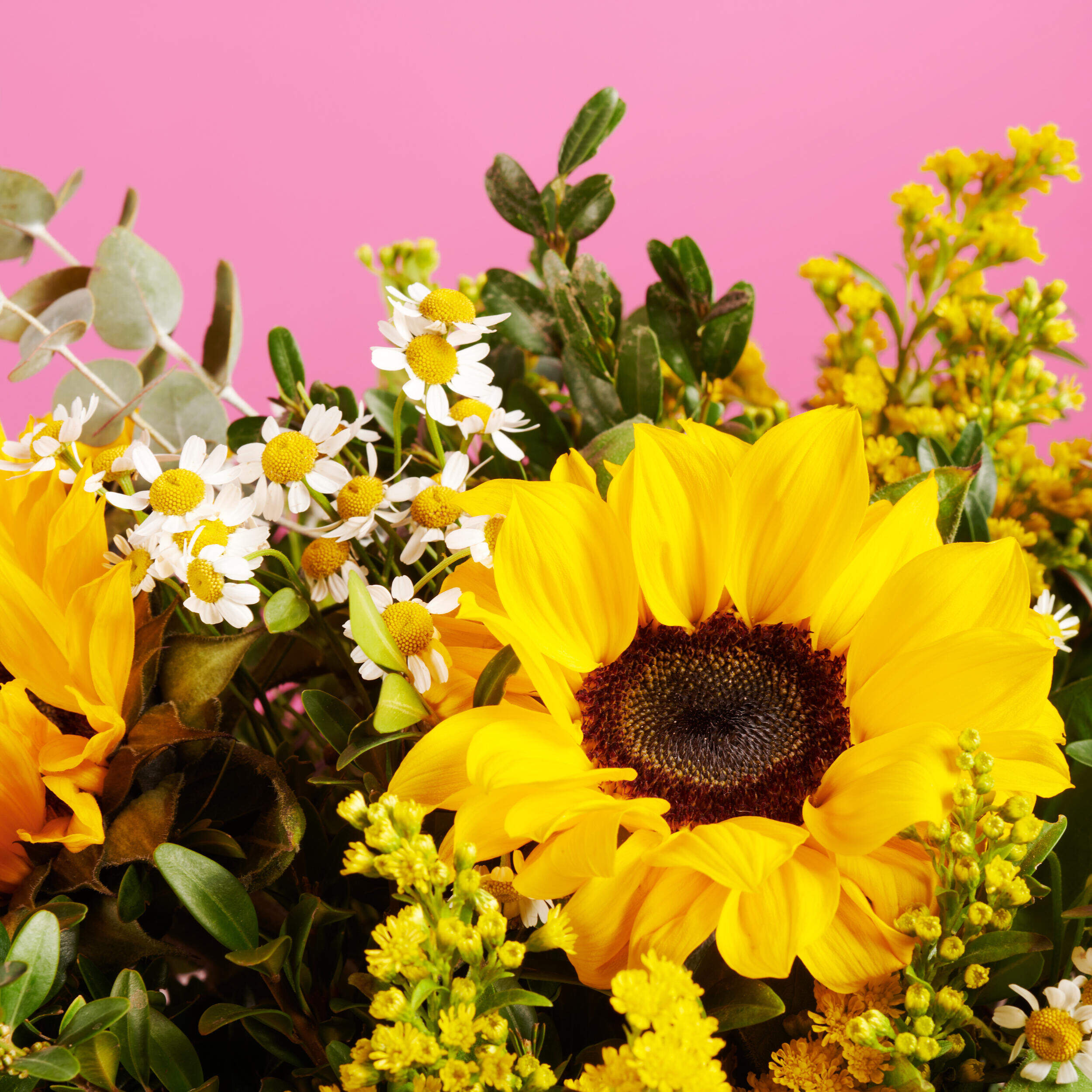 La luz de nuestros girasoles se funde con la delicadeza de nuestra matricaria más suave en presencia de una densa vegetación, que aporta ese frescor tan deseado en primavera. Tómate un respiro y sorprende con esta combinación de contrastes creando momentos irrepetibles con nuestro Sol Vibrante.