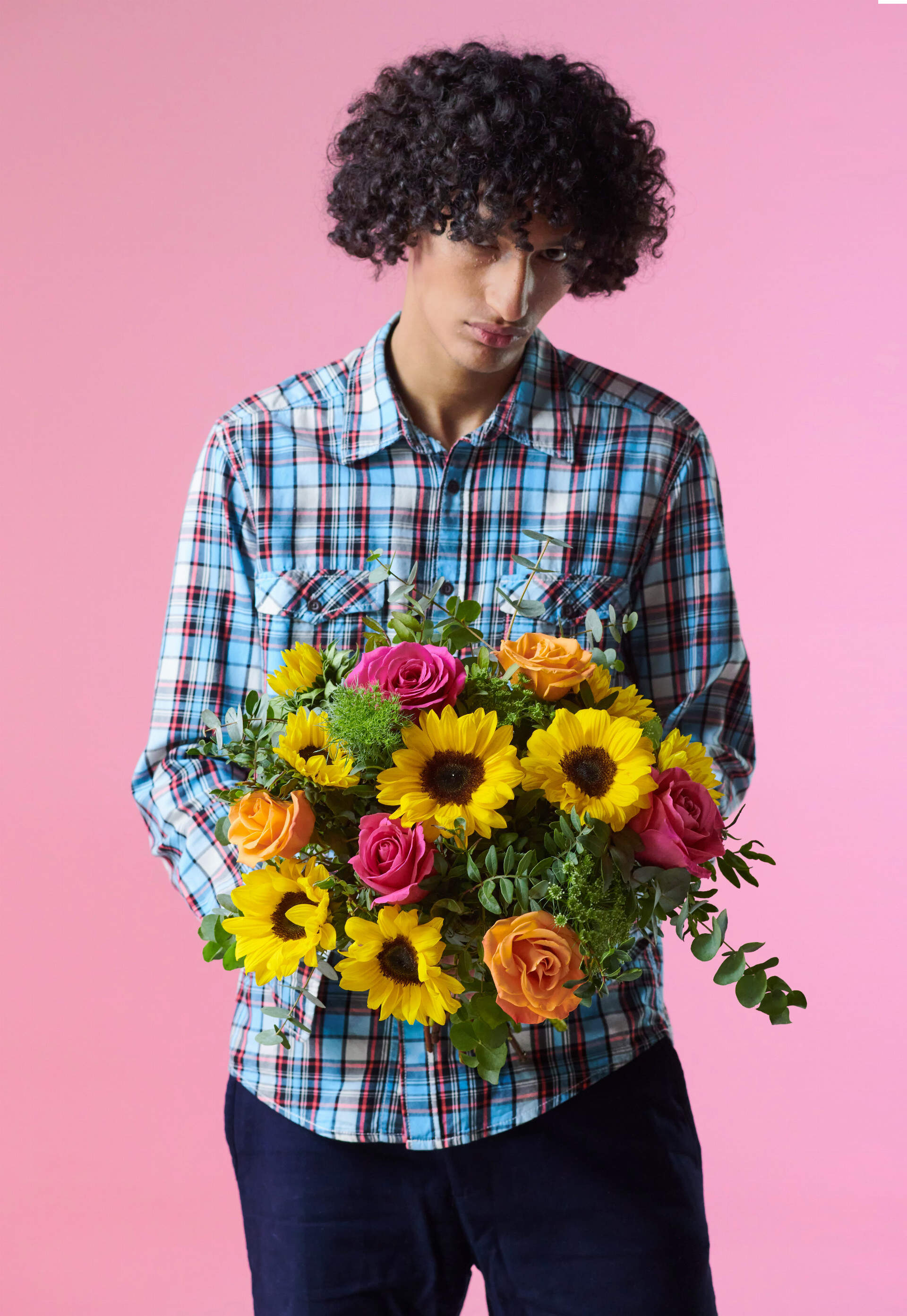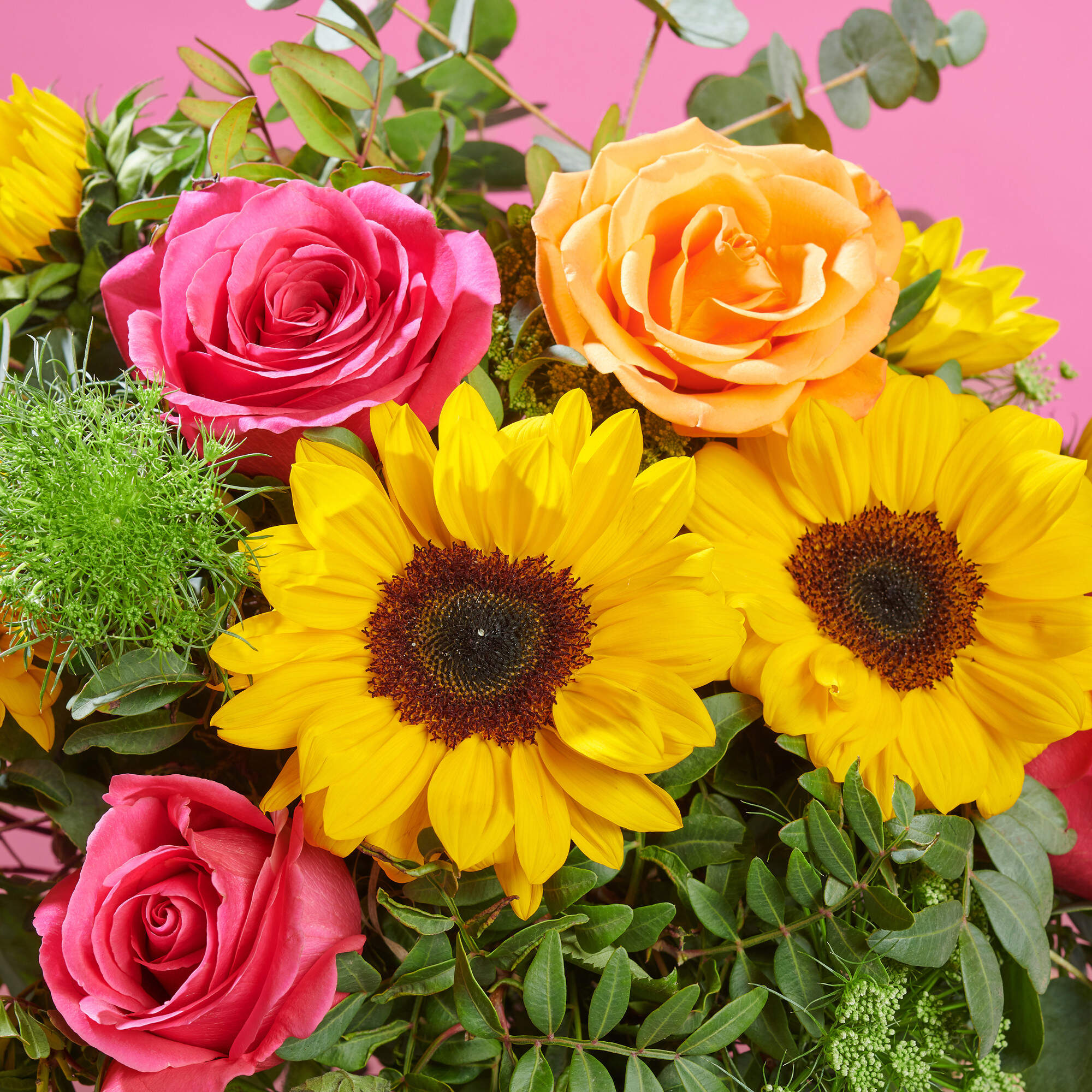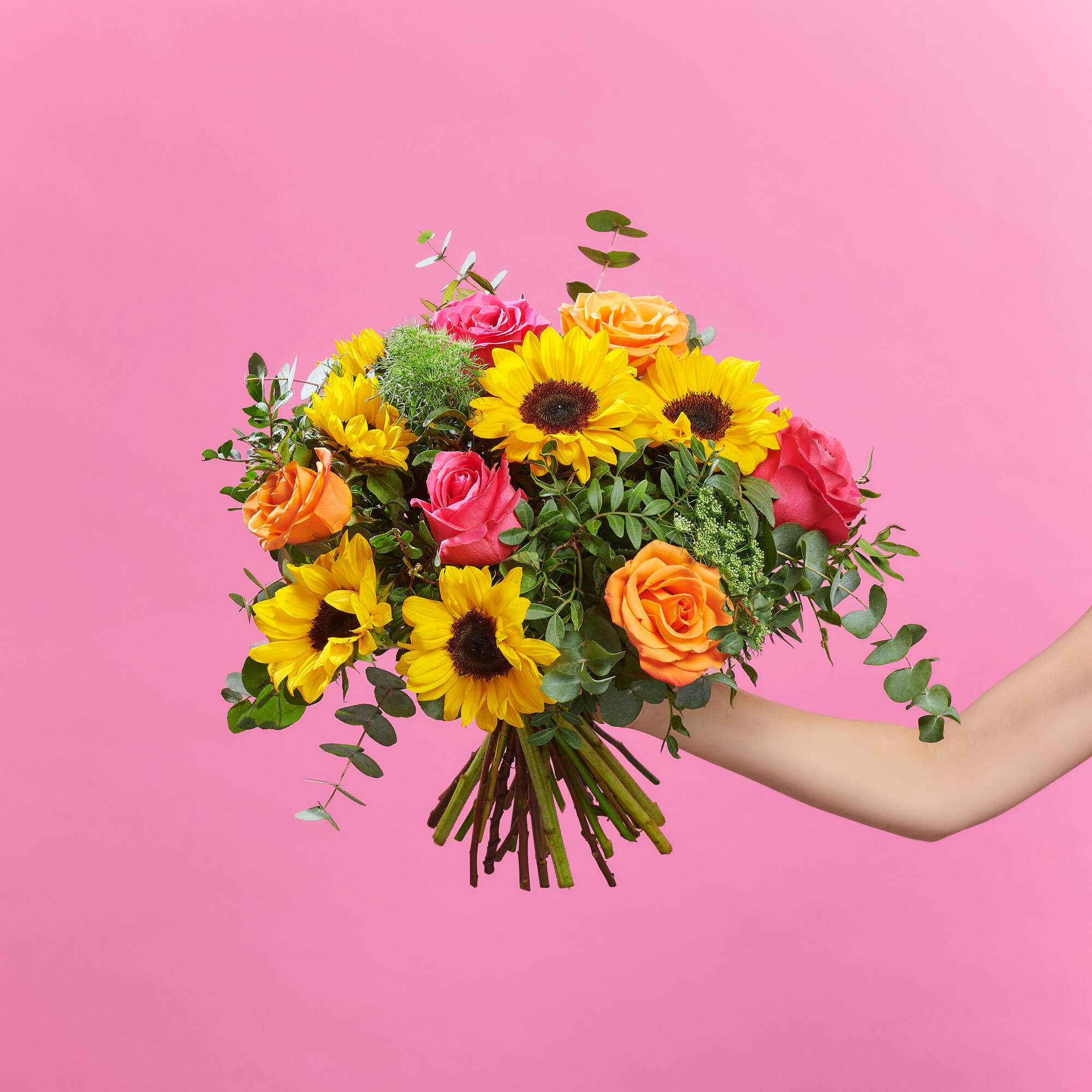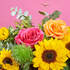 El naranja en el verano lo es todo: los melocotones, albaricoques, el amanecer que pone fin a las increíbles noches de verano. Por eso en Bésame no nos hemos podido resistir a mezclarlo con el amarillo y el rosa para crear Soles y arrebol. Más que un ramo de girasoles esta composición es una explosi
