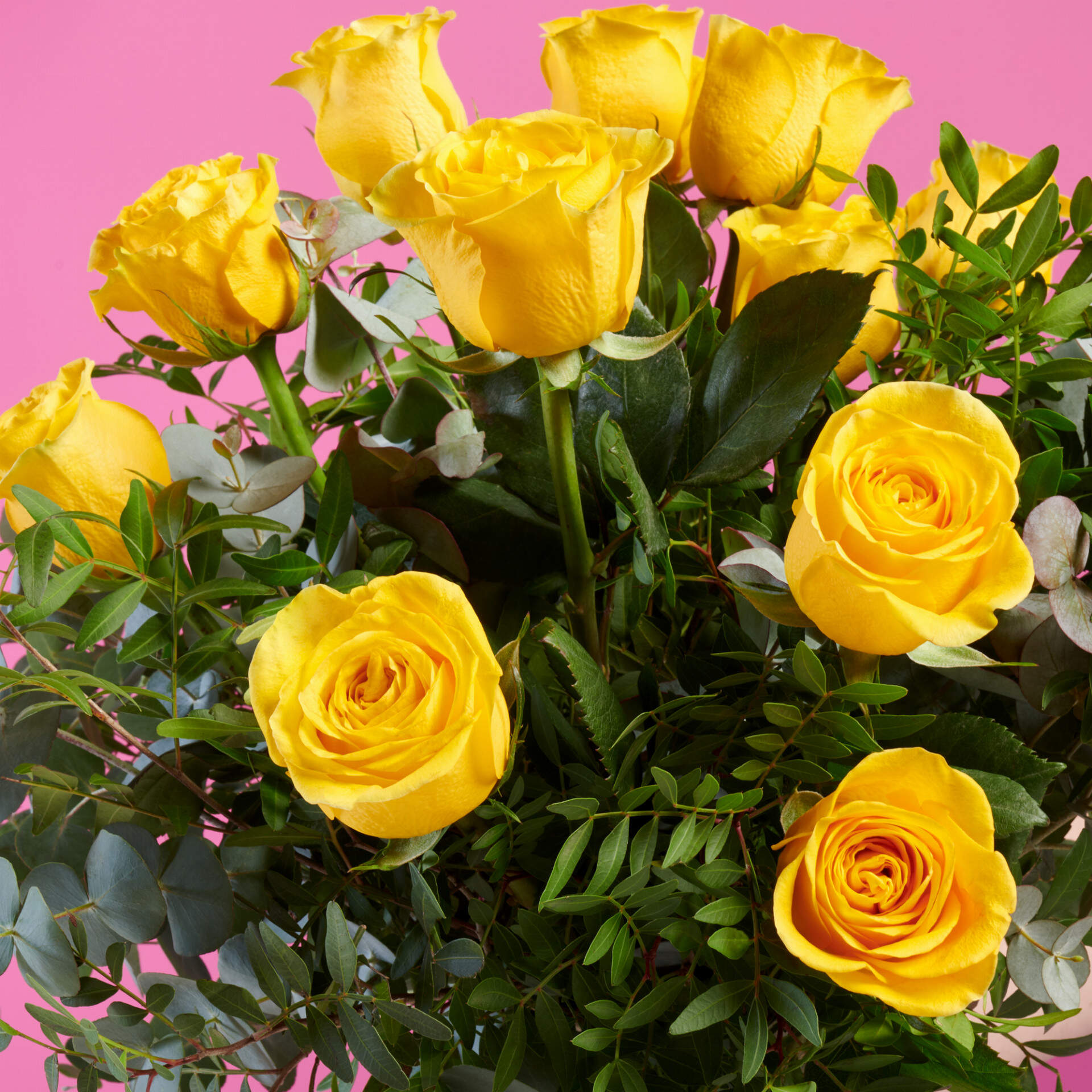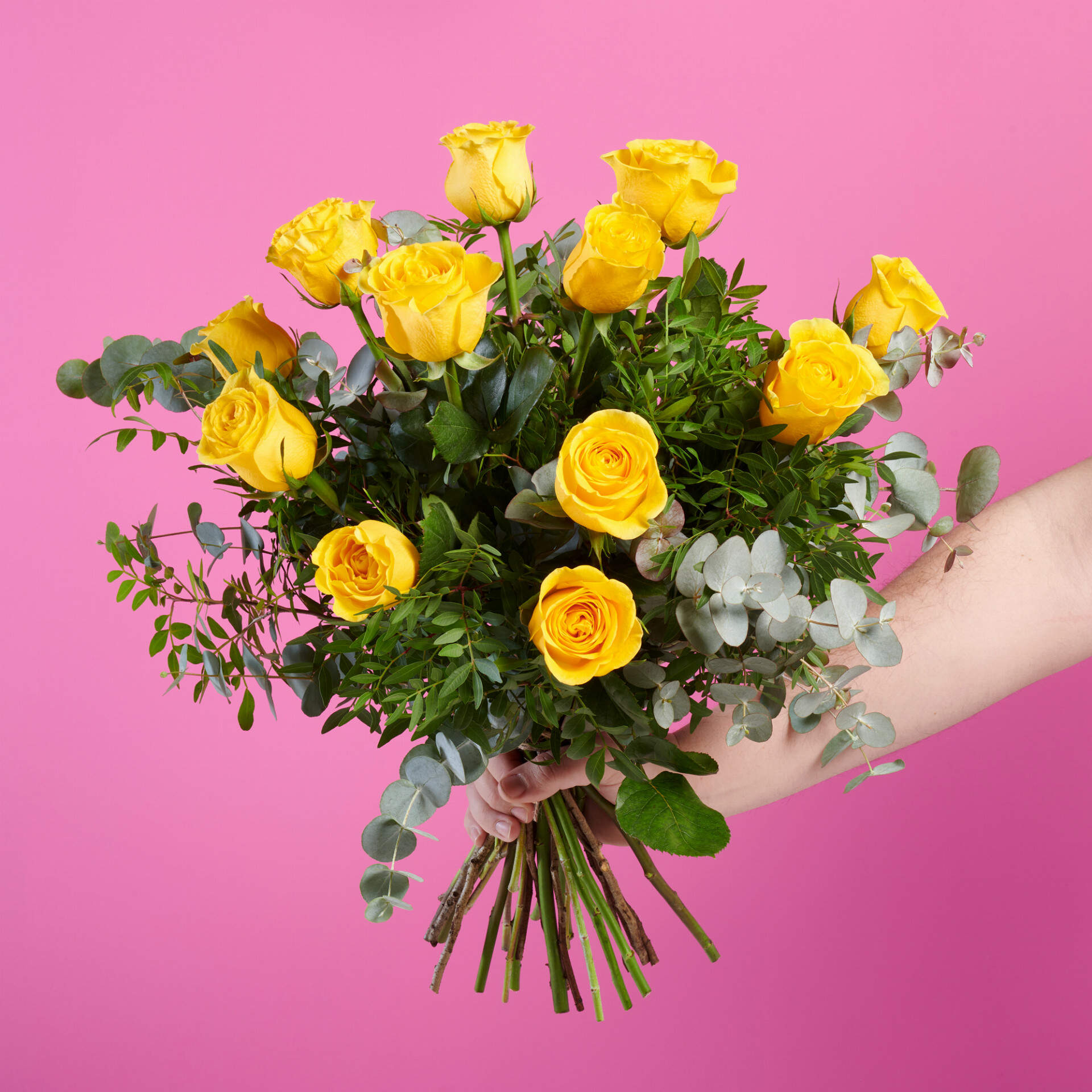 Una explosión de color que llenará de alegría a cualquier persona que lo reciba. Este espectacular ramo de rosas amarillas de nuestra colección de Besos es solo apto para esas personas que brillan con luz propia.