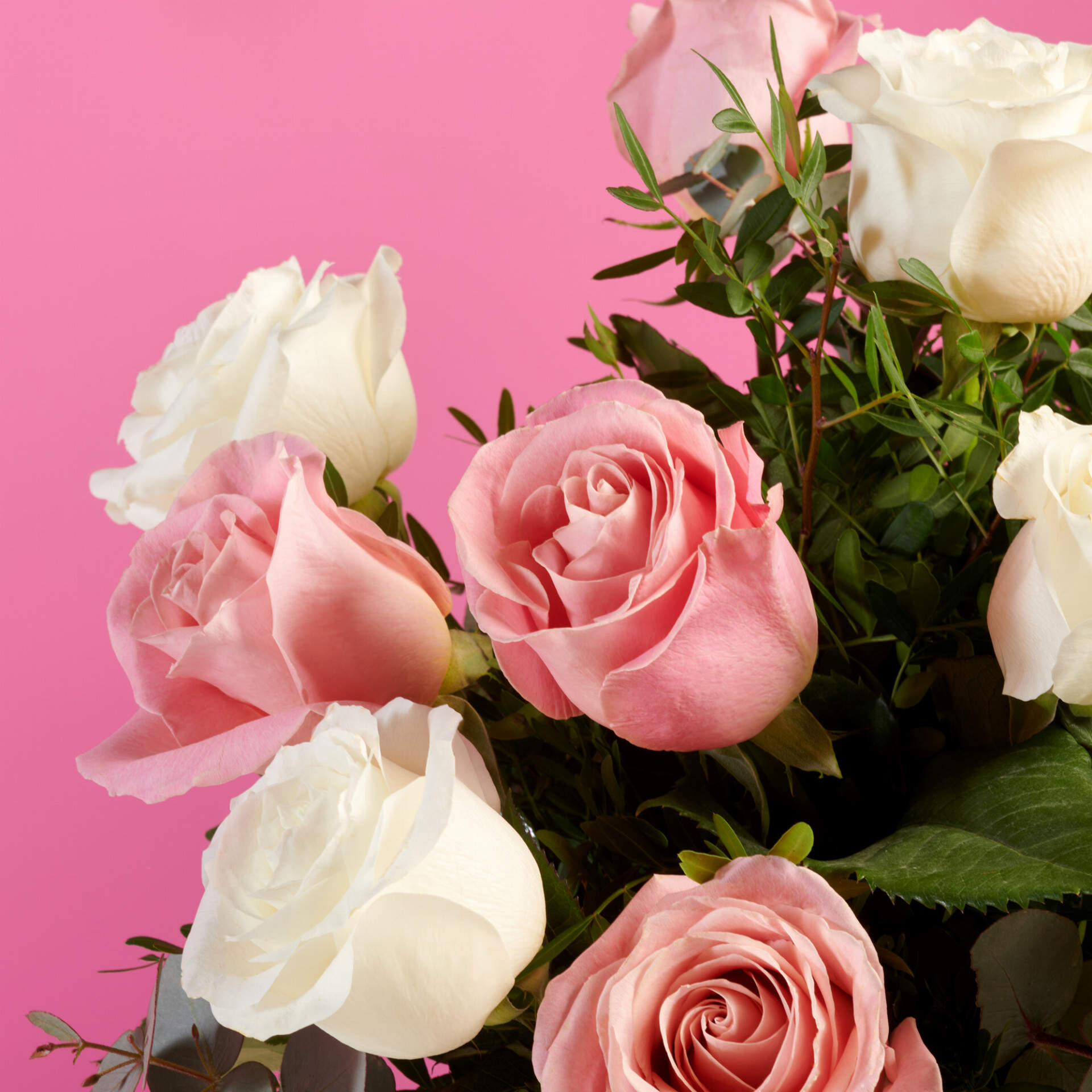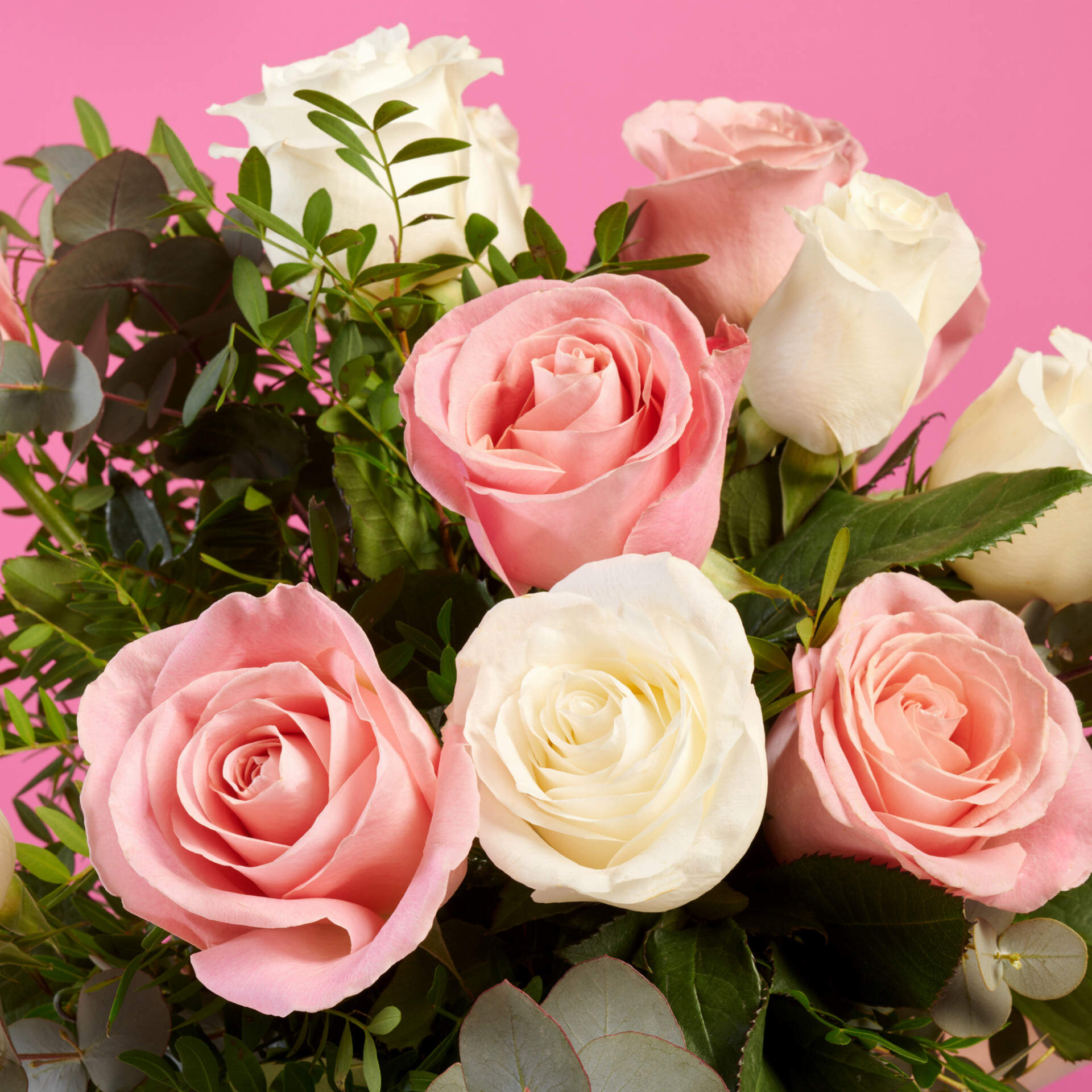 Nuestro ramo de flores Beso Dulce esta compuesto de nuestras mejores rosas de color rosa claro y blanco combinados con nuestros mejores eucaliptos y lentiscos de cultivos locales y sostenibles dan lugar a un ramo de flores fresco y original.
