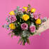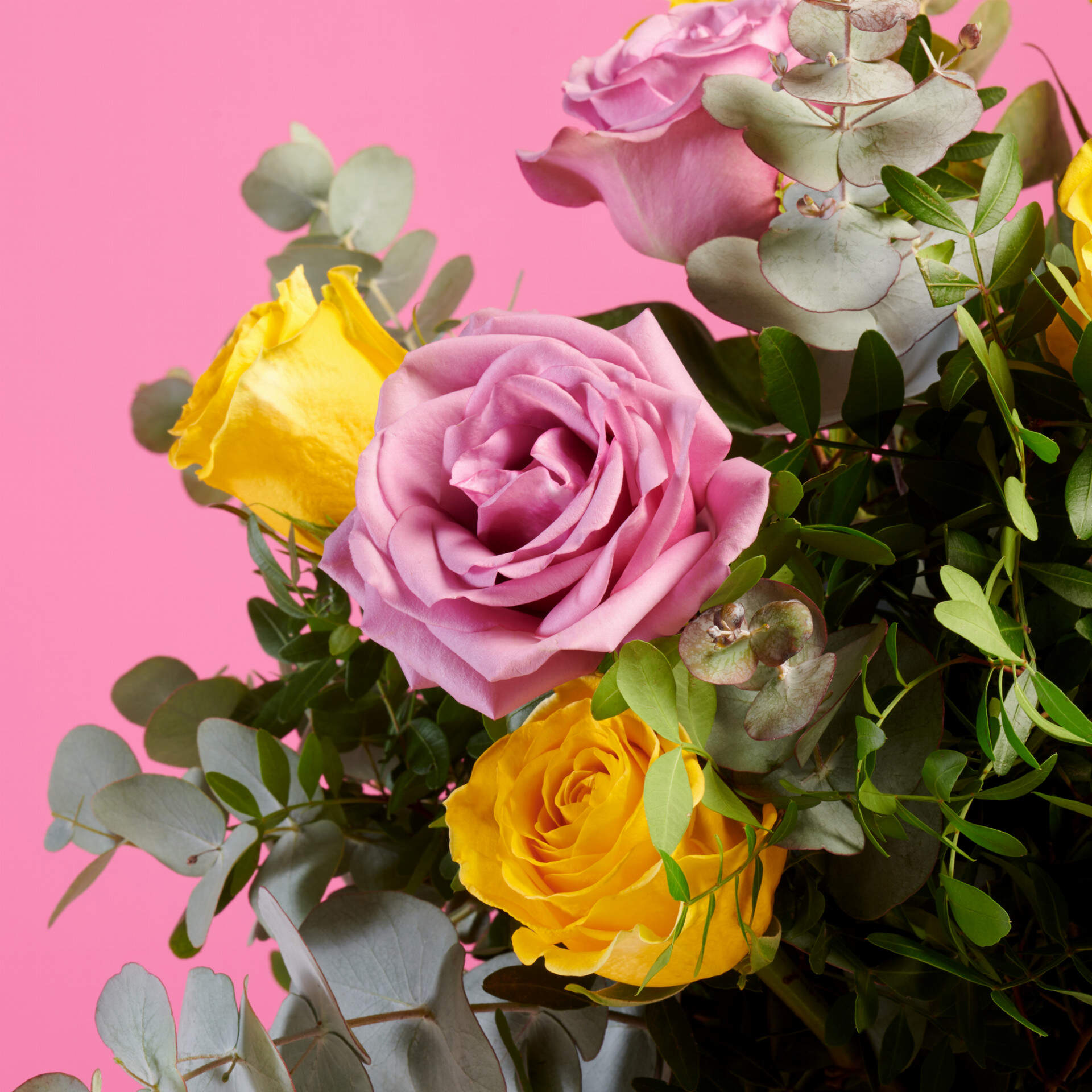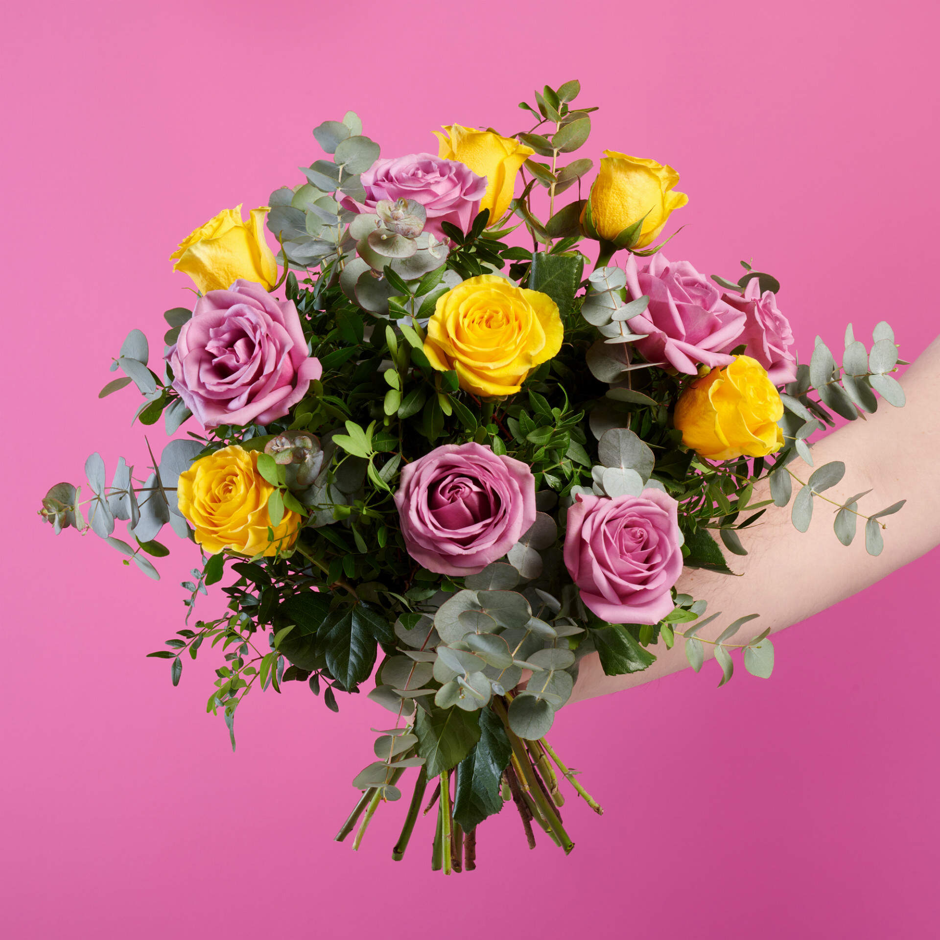 Un rayo de luz, un intenso destello, así es nuestro Beso Indiscreto. Un ramo compuesto por rosas amarillas, lilas y nuestros mejores verdes frescos como eucalipto y Lentisco.