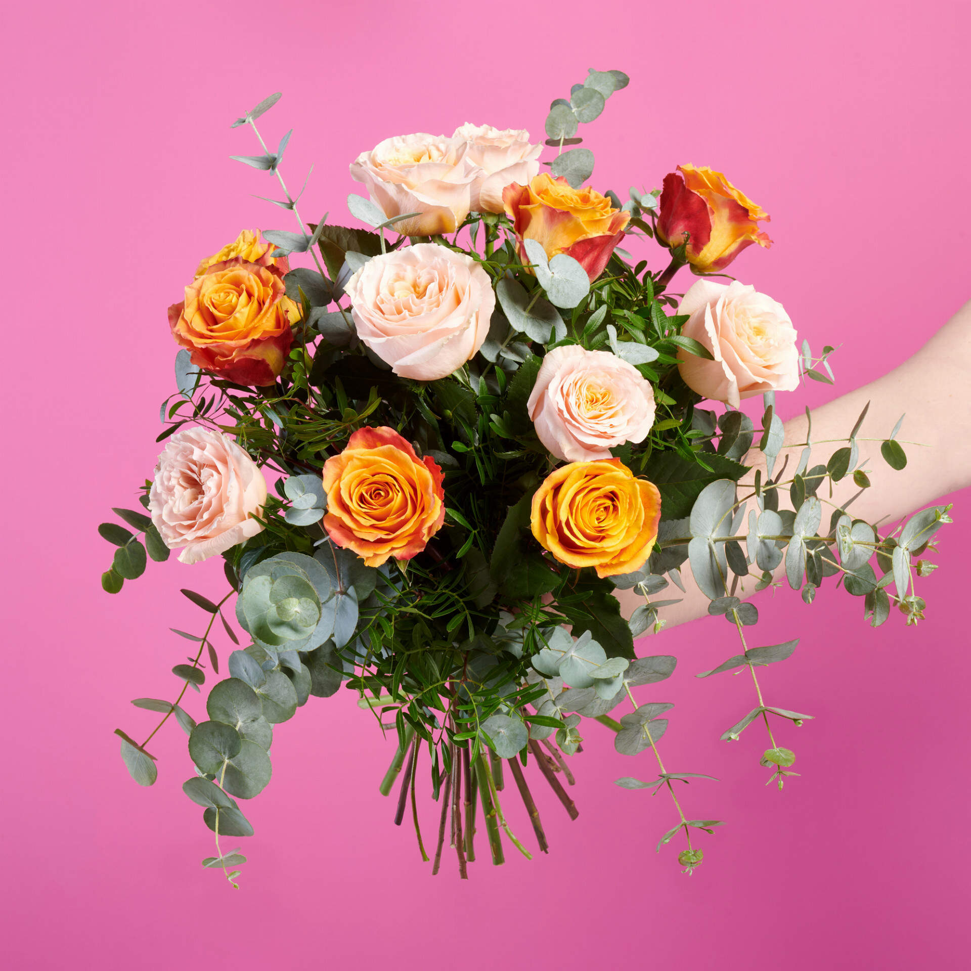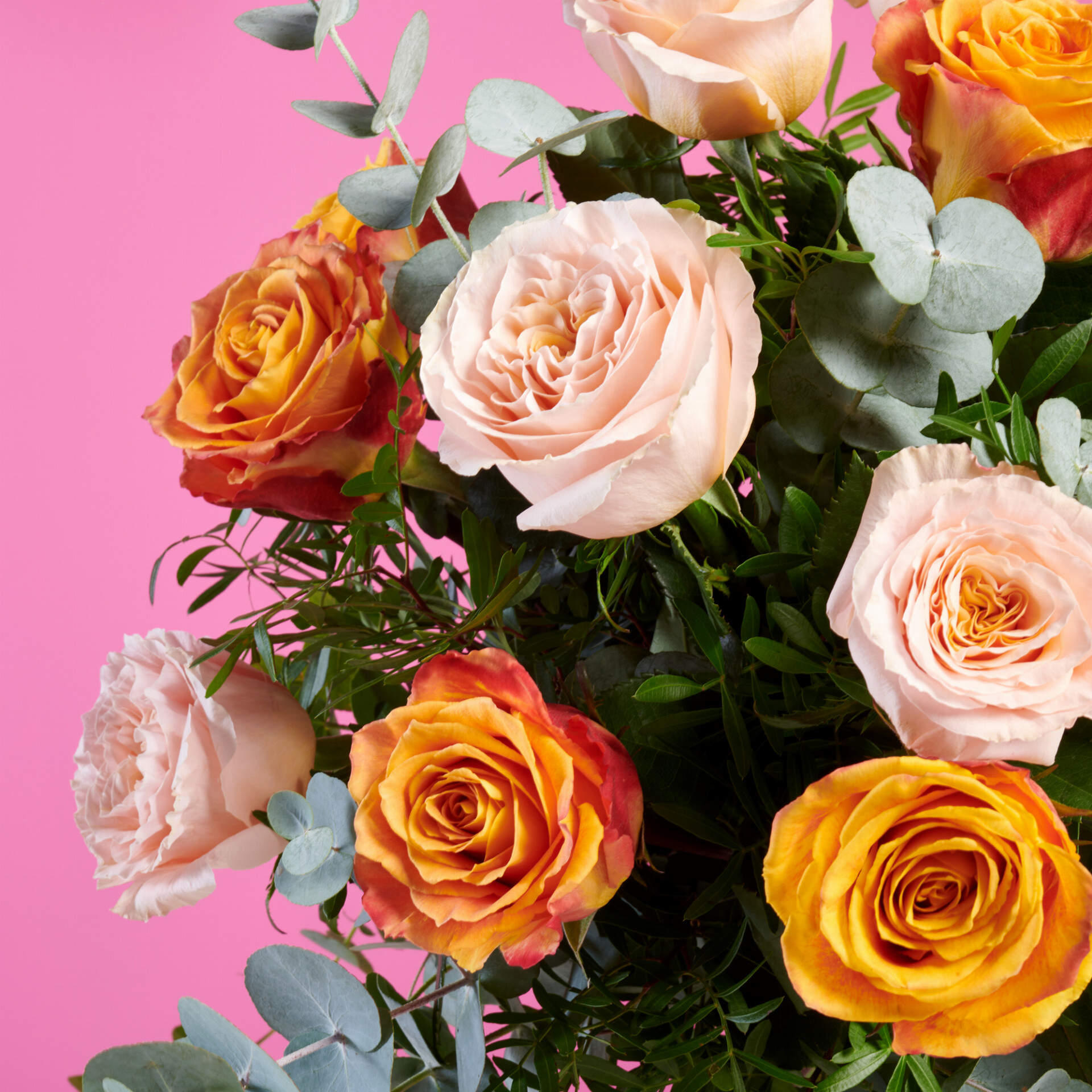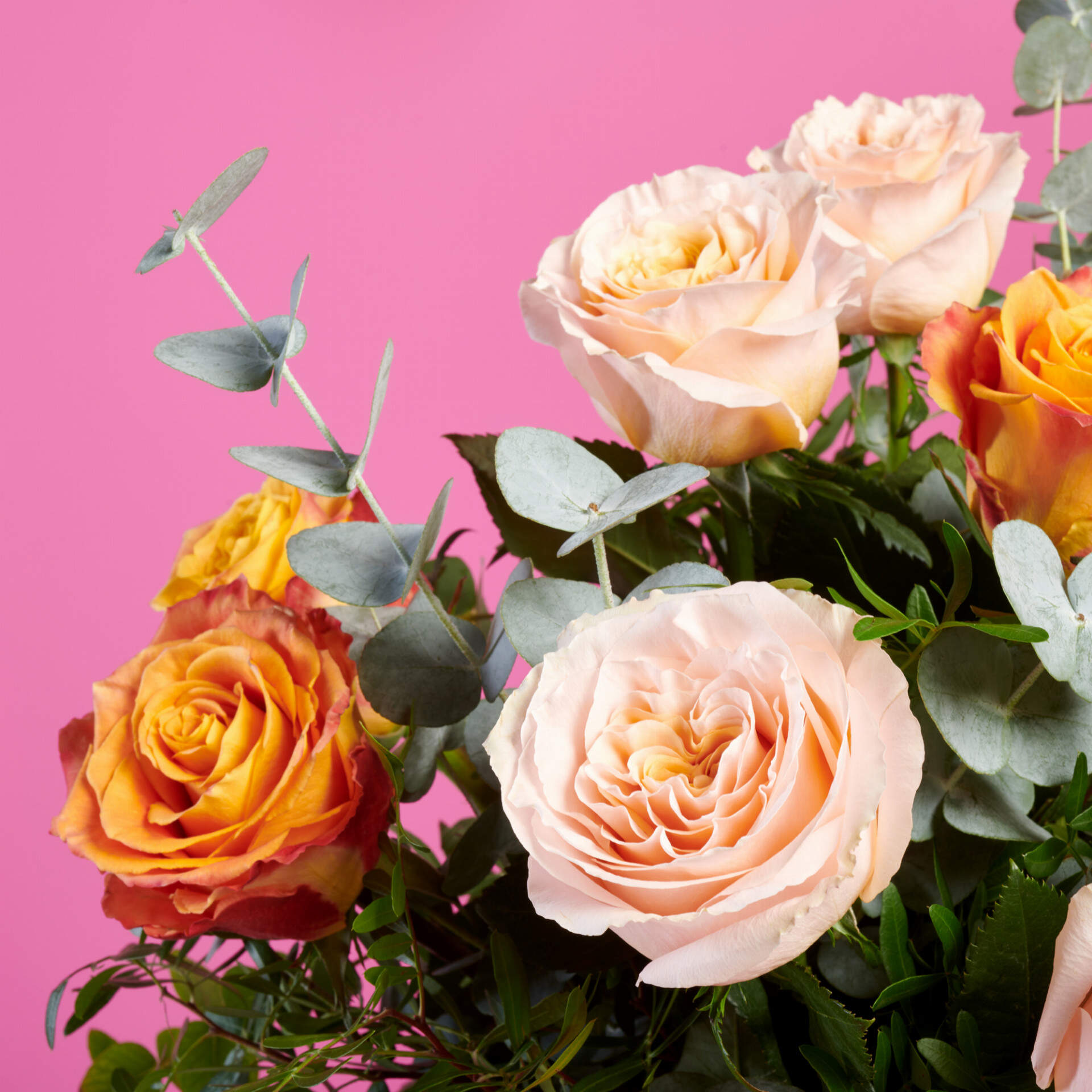 Nuestro ramo de flores Beso Soñado esta compuesto de nuestras mejores rosas de color rosa claro y naranja combinados con nuestros mejores eucaliptos y lentiscos de cultivos locales y sostenibles dan lugar a un ramo de flores fresco y original.