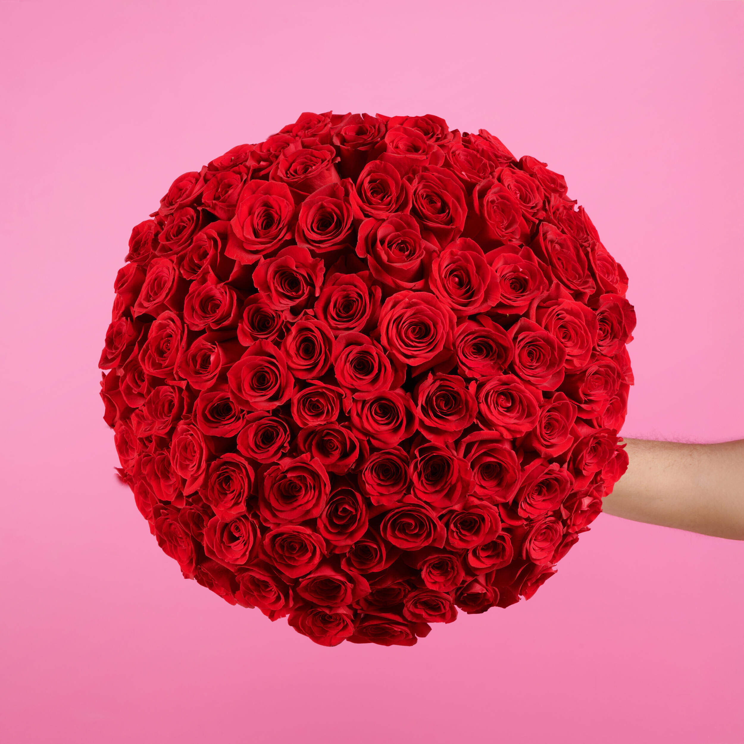 Creado a partir de las mejores rosas rojas del mercado, nuestro ramo que contiene 100 rosas rojas de tallo largo presentado en forma de bola y con la empuñadura de lazo rojo.