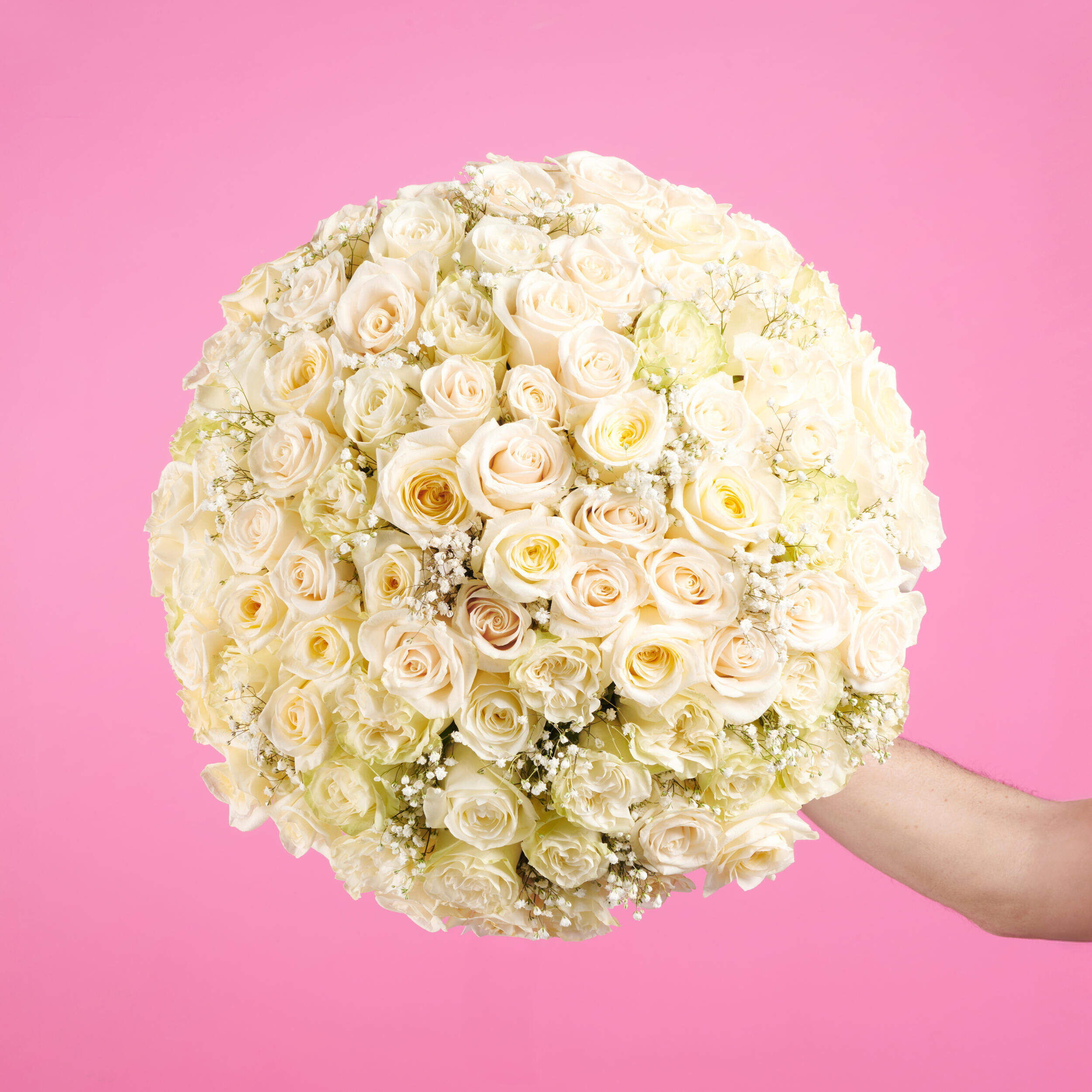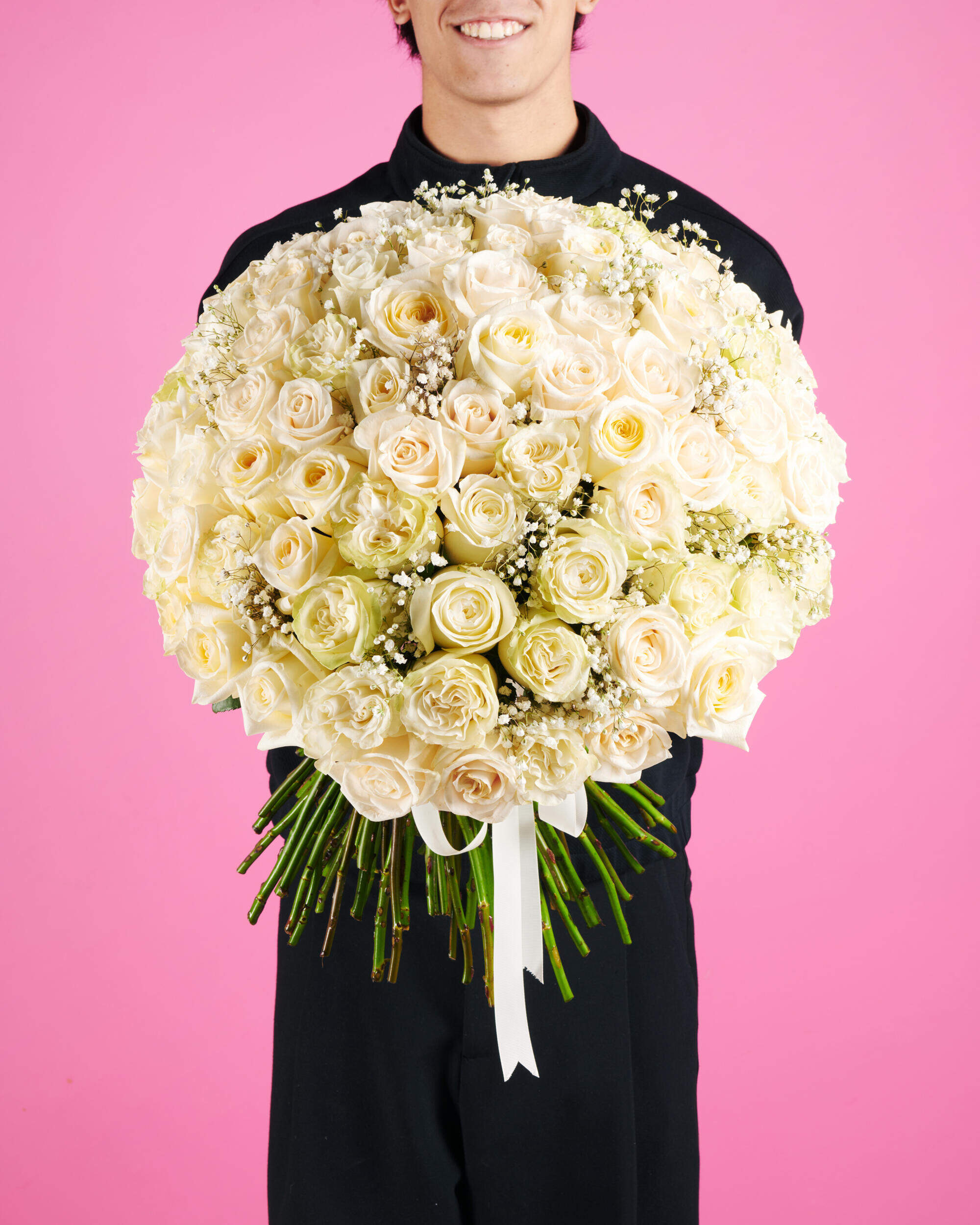 Creado a partir de las mejores rosas rojas del mercado, nuestro ramo que contiene 100 rosas blancas de tallo largo presentado en forma de esfera y con la empuñadura de lazo blanco.