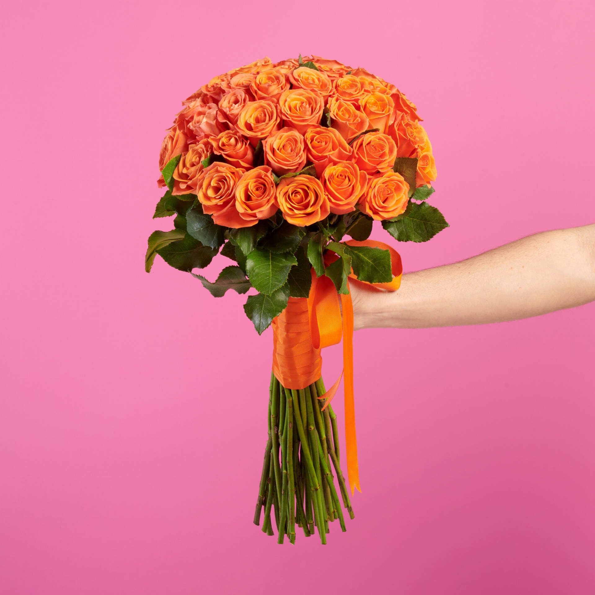 Ramo de rosas Naranjas creado a partir de las mejores rosas del mercado, este ramo que contiene 40 rosas naranjas de tallo largo, se prepara en forma de bola y con la empuñadura de lazo naranja.