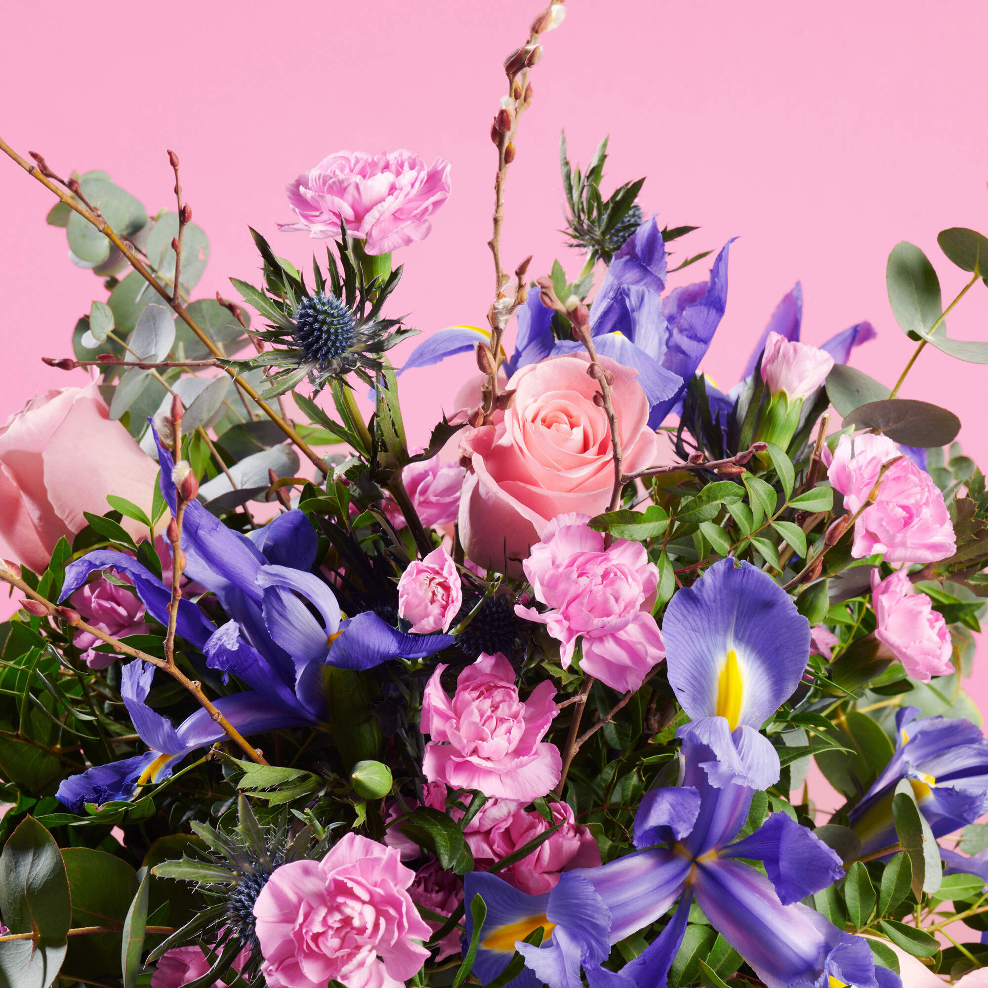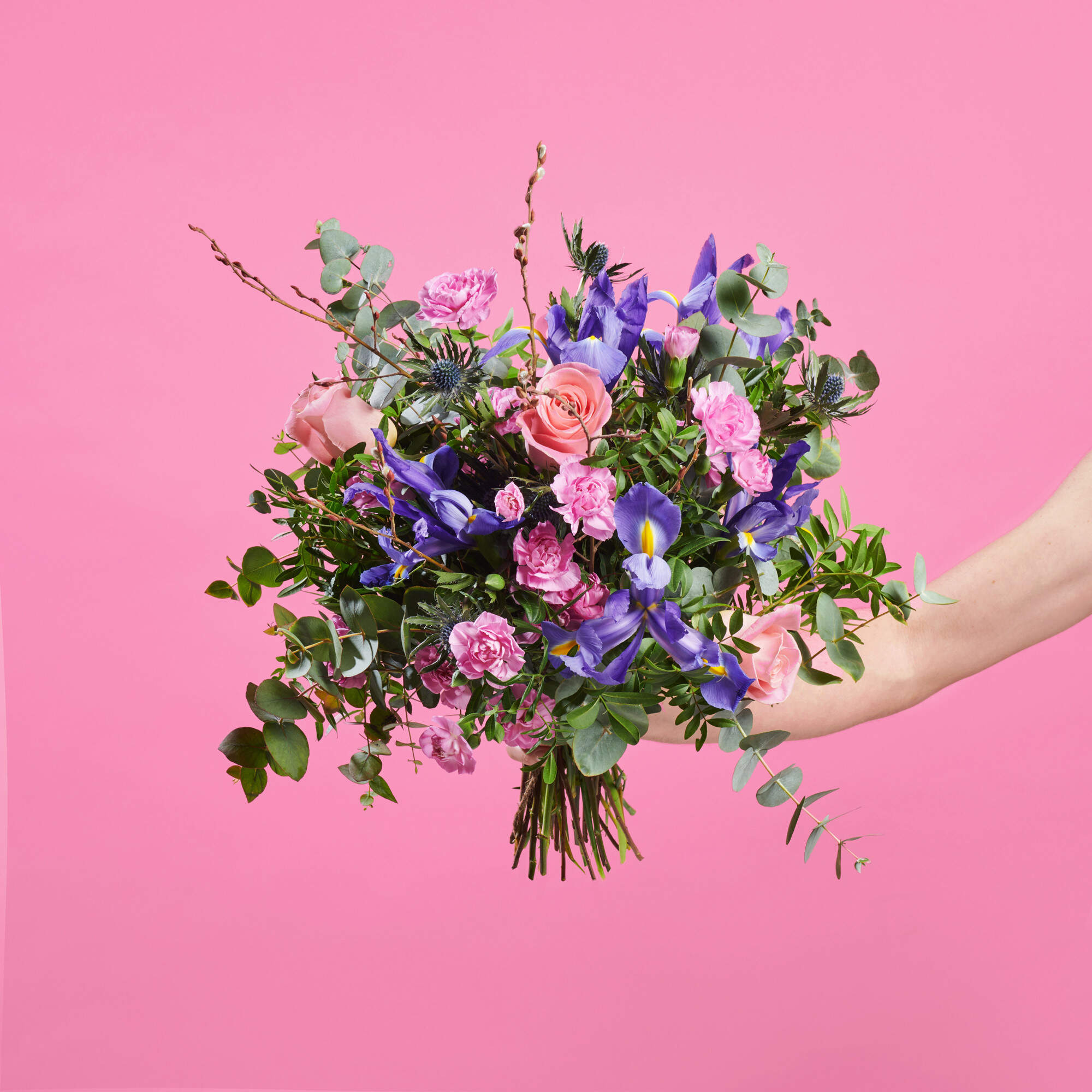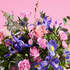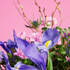 Jacaranda, es el ramo de flores silvestres que hemos elaborado en nuestro taller con mucho amor, llenará tu casa de flores y creará un ambiente especial en el día de los enamorados. Para ello hemos seleccionado: Elaborado con 3 rosas de color rosa, 4 claveles mini, 5 Iris azules, y una cuidada selección de verdes con Salix, Eucalipto, lentisco y retama.