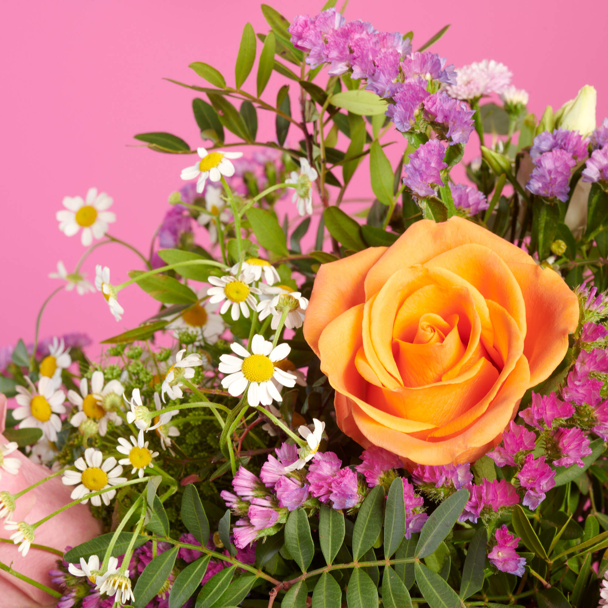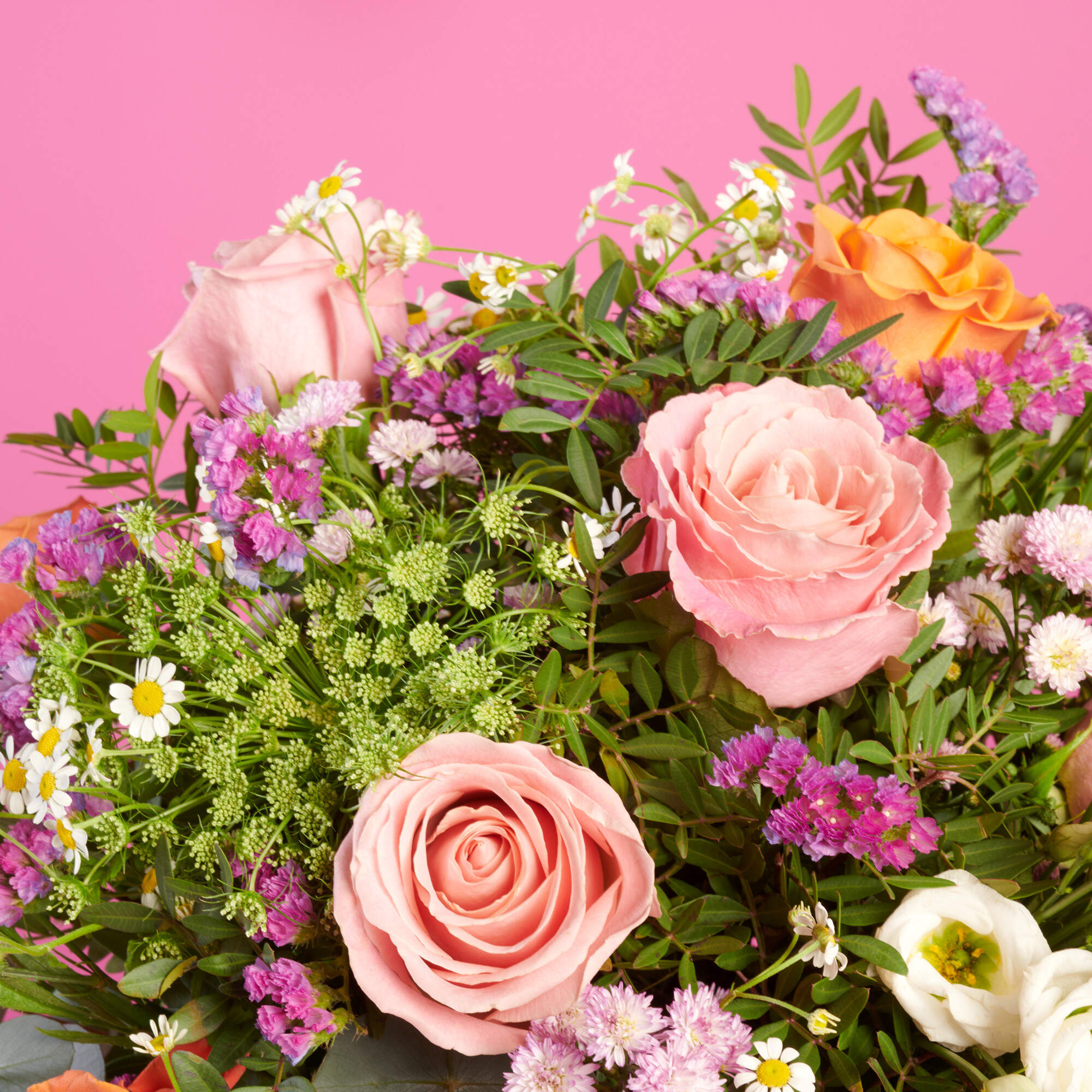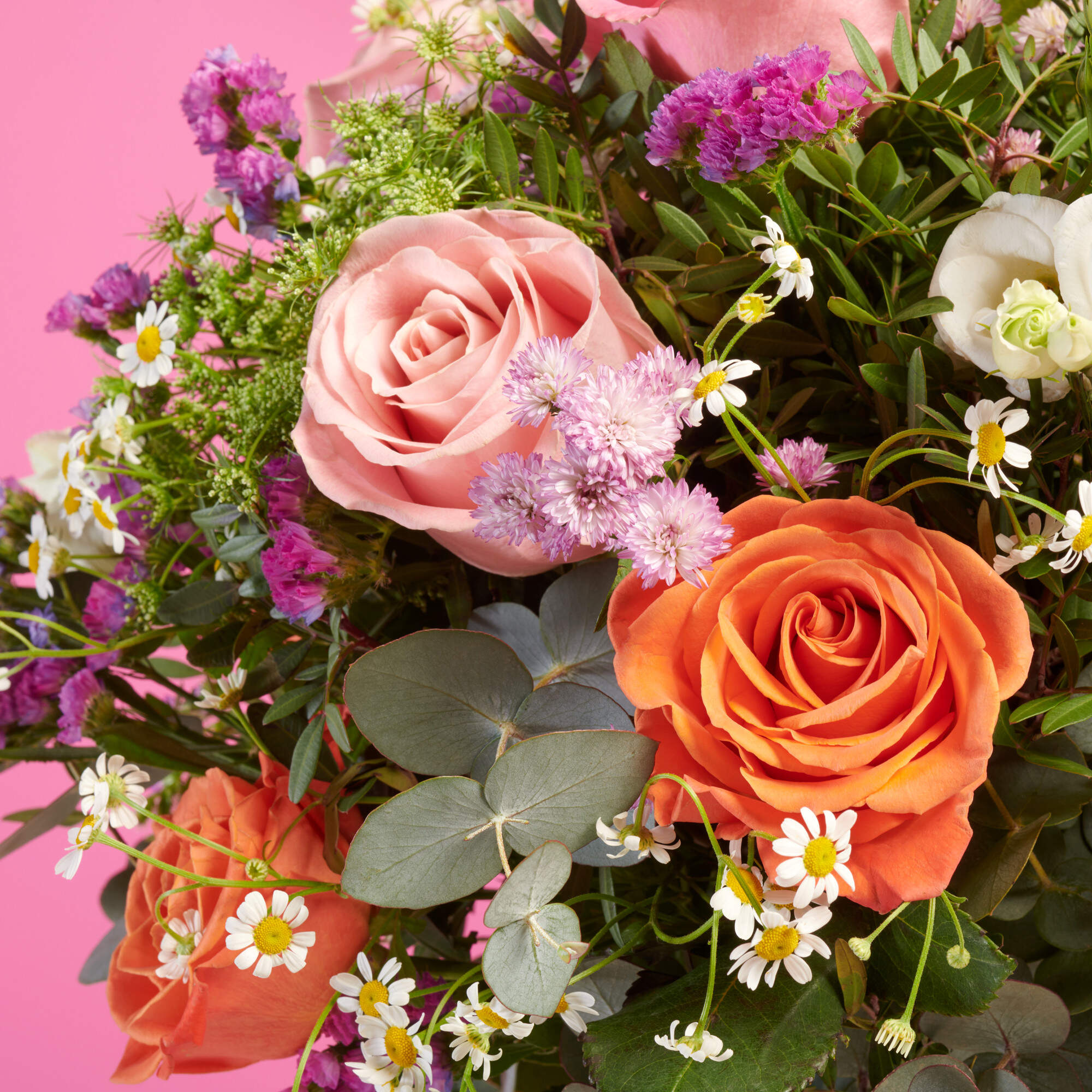 Olor a duende es pura magia, 5 rosas hermosas de la máxima calidad combinadas con claveles salmón, Tanacetum blanco, Statice rosa, Escabiosa lila y Lisianthus blancos todo ello combinado con nuestros verdes, lentisco y eucalipto de máxima calidad, y de cultivos sostenibles y locales.